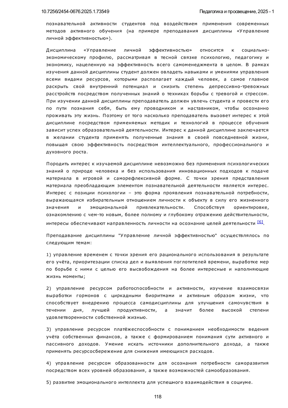 В научной статье рассматривается опыт применения активных методов обучения в процессе преподавания дисциплины «Управление личной эффективностью» для студентов первого курса Читинского института Байкальского государственного университета. Объектом исследования стало изучение технологии обучения студентов управлению личной эффективностью, что включало в себя разработку и апробацию последовательности применения психолого-педагогических приёмов и методов, встраиваемых в технологическую карту прохождениями основных разделов изучения данной дисциплины. Предметом исследования стало применение методов активного обучения в процессе изучения данной дисциплины. Целью исследования является изучение познавательной активности студентов под воздействием применения современных методов активного обучения. Областью применения результатов исследования является такой раздел общей педагогики как педагогическая технология. Для достижения цели и решения поставленных задач был проведён опрос студентов для оценки степени их интереса и познавательной активности в процессе изучения дисциплины, который выявил высокий уровень их заинтересованности и мотивации к улучшению всех сфер своей жизнедеятельности, а также продемонстрировал какие методы активного обучения являются более действенными. Для проведения исследования использовались методы обобщения, социологических исследований в виде проведенного опроса студентов, а также методы анализа и синтеза полученной в ходе анкетирования информации. Научная новизна данного исследования носит научно-практический характер для разработки рекомендаций по выбору наиболее эффективных методов активного обучения с целью развития познавательной активности студентов в изучении дисциплины “Управление личной эффективностью”. В результате исследования были выявлены наиболее интересующие студентов разделы изучения дисциплины, которые на сегодняшний момент находят больший отклик, определена эффективность использования активных методов обучения в процессе её изучения. Все сделанные выводы по результатам исследования должны стать основанием для внесения изменений в технологическую карту процесса обучения. Проведённое исследование также продемонстрировало актуальность и значимость преподавания данной дисциплины для молодёжи, новой генерации общества, так как развитие государства зависит от личного вклада каждого, а социально-экономическое развитие общества - от повышения личной эффективности каждого индивида.