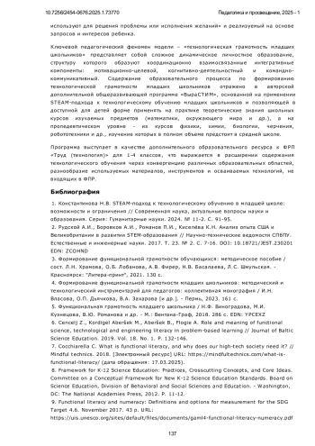 1. Константинова Н.В. STEAM-подход к технологическому обучению в младшей школе: возможности и ограничения // Современная наука, актуальные вопросы науки и образования. Серия: Гуманитарные науки. 2024. № 11-2. С. 91-95.