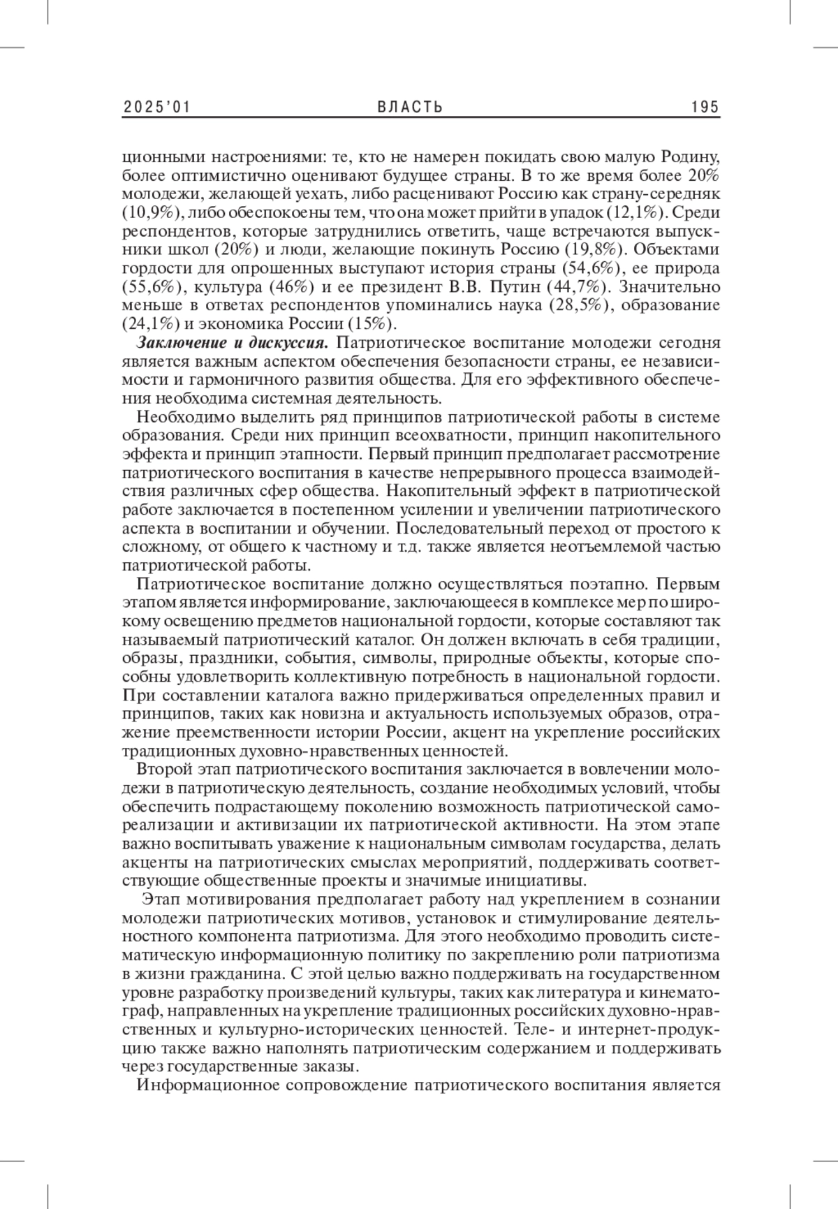 6. Парма Р.В. 2023. Патриотические настроения студенческой молодежи в современной России. - Власть. Т. 31. № 3. С. 17-24. EDN: NQJRDO
