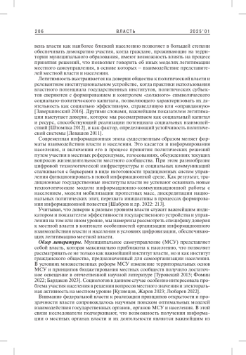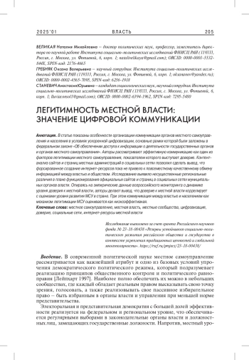 В статье показаны особенности организации коммуникации органов местного самоуправления и населения в условиях ускоренной цифровизации, основные рамки которой были заложены в федеральном законе «Об обеспечении доступа к информации о деятельности государственных органов и органов местного самоуправления». Авторы рассматривают эффективную коммуникацию как один из факторов легитимации местного самоуправления, показателем которого выступает доверие. Контент-анализ сайтов и страниц местных администраций в социальных сетях позволил сделать вывод, что форсированное создание интернет-ресурсов пока не привело к повсеместному качественному обмену информацией между властью и обществом. Исследование выявило несущественные региональные различия в плане функционирования официальных сайтов и страниц в социальных сетях муниципальных органов власти. Опираясь на эмпирические данные всероссийского мониторинга о динамике уровня доверия к местной власти, авторы делают вывод, что доверие к местной власти коррелирует с оценками уровня развития МСУ в стране. При этом коммуникация между властью и населением как механизм легитимации МСУ оценивается как низкоэффективная.