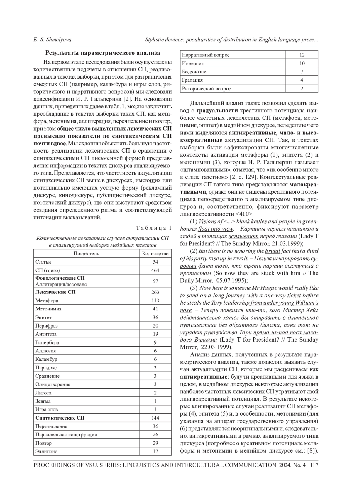 8. Шмелёва Е. С. Лингвокреативный потенциал реализации метафоры и метонимии в медийном дискурсе (на материале англо- и русскоязычных таблоидов 2000-2022 гг. //Когнитивные исследования языка. 2024. № 1-1 (57). С. 99-103. EDN: QMHTEQ