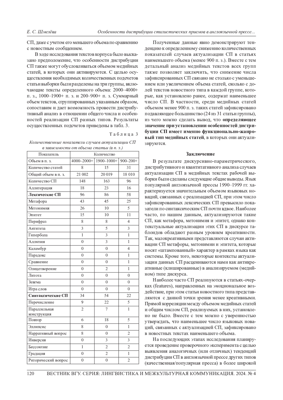 Данная работа посвящена актуальным вопросам текстоформирования в дискурсе разных типов и направлена на выявление общих тенденций реализации стилистических приемов (СП) в текстах медиа. Исследование указанной проблематики осуществлено с применением методик дискурсивно-параметрического, количественного и дистрибутивного анализа. Материалом для анализа послужила репрезентативная выборка статей из тиражных англоязычных таблоидов 1990-1999 гг., что в дальнейшем позволит рассмотреть явление в диахронической перспективе. В результате анализа сделан вывод об активности реализации СП в текстах популярной англоязычной прессы, при этом число лексических СП, по нашим данным, значительно превысило количество установленных случаев активации синтаксических СП. Также было сделано наблюдение о градуальном характере реализации лингвокреативного потенциала наиболее частотных СП (а именно метафоры, метонимии и эпитета), вследствие чего контекстуальные актуализации данныхСП в дискурсе медиа могут оцениваться как мало-, высоко- и антикреативные. Антикреативными мы считаем такие лингвокреатемы, которые обладают сниженным креативным потенциалом в дискурсе выбранного типа, но при этом их креативный потенциал может существенно возрастать при реализации в дискурсах других типов, например, в художественном. Анализ зависимости дистрибуции СП от таких показателей, как функционально-жанровый тип статьи (по Т. Г. Добросклонской) и ее объем, позволяет заключить, что наибольший объем языковых новаций, связанных с актуализацией СП, содержится в статьях-очерках (features), реализующих, помимо информирования, функцию оценки и эмоцонального воздействия на реципиента.