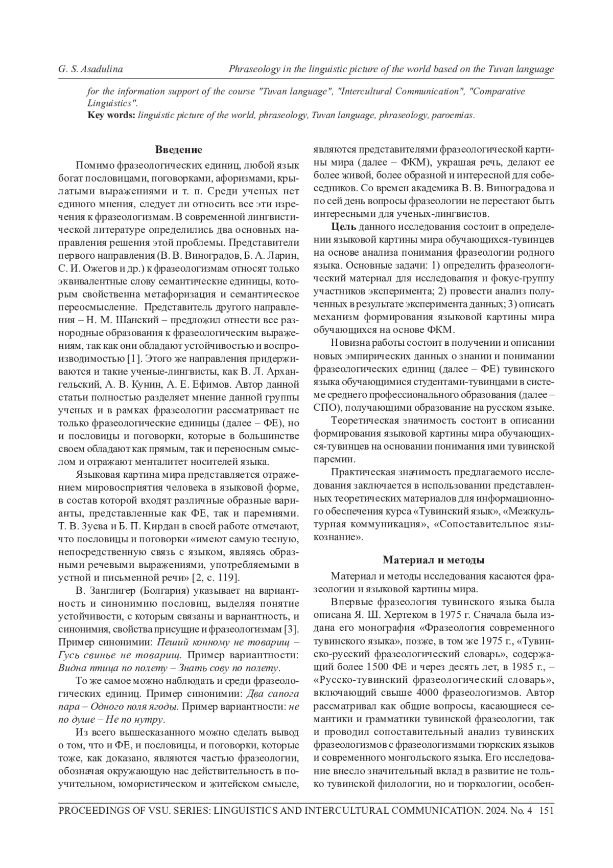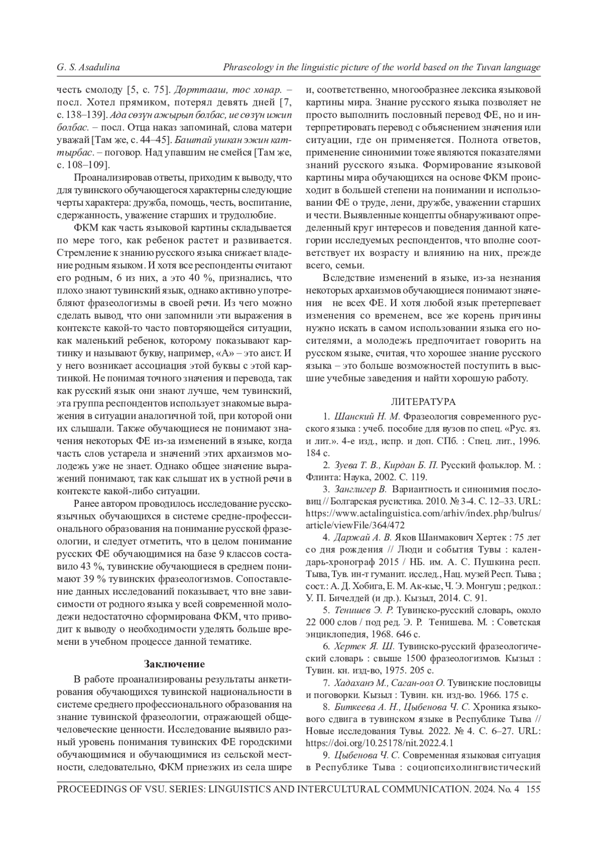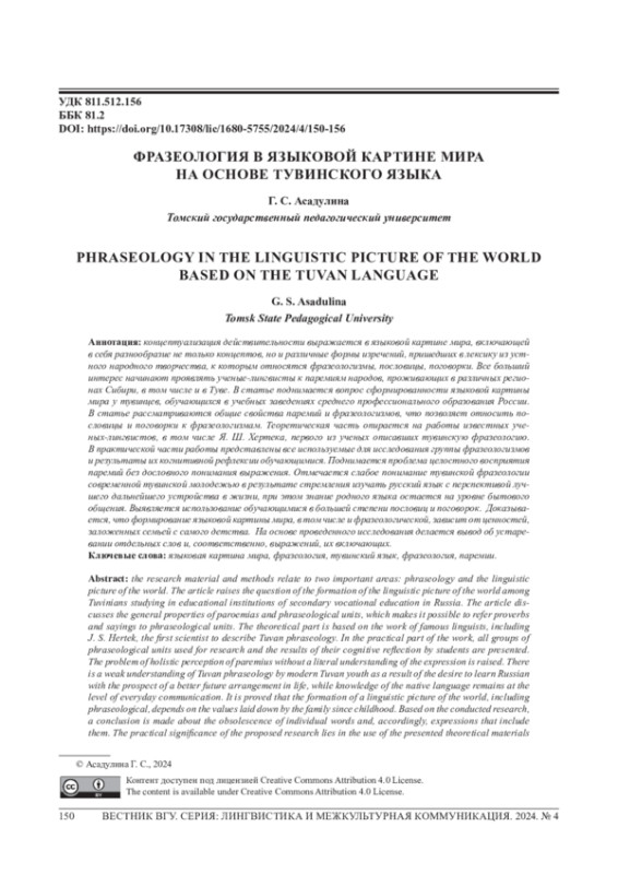 Концептуализация действительности выражается в языковой картине мира, включающей в себя разнообразие не только концептов, но и различные формы изречений, пришедших в лексику из устного народного творчества, к которым относятся фразеологизмы, пословицы, поговорки. Все больший интерес начинают проявлять ученые-лингвисты к паремиям народов, проживающих в различных регионах Сибири, в том числе и в Туве. В статье поднимается вопрос сформированности языковой картины мира у тувинцев, обучающихся в учебных заведениях среднего профессионального образования России. В статье рассматриваются общие свойства паремий и фразеологизмов, что позволяет относить пословицы и поговорки к фразеологизмам. Теоретическая часть опирается на работы известных ученых-лингвистов, в том числе Я. Ш. Хертека, первого из ученых описавших тувинскую фразеологию. В практической части работы представлены все используемые для исследования группы фразеологизмов и результаты их когнитивной рефлексии обучающимися. Поднимается проблема целостного восприятия паремий без дословного понимания выражения. Отмечается слабое понимание тувинской фразеологии современной тувинской молодежью в результате стремления изучать русский язык с перспективой лучшего дальнейшего устройства в жизни, при этом знание родного языка остается на уровне бытового общения. Выявляется использование обучающимися в большей степени пословиц и поговорок. Доказывается, что формирование языковой картины мира, в том числе и фразеологической, зависит от ценностей, заложенных семьей с самого детства.