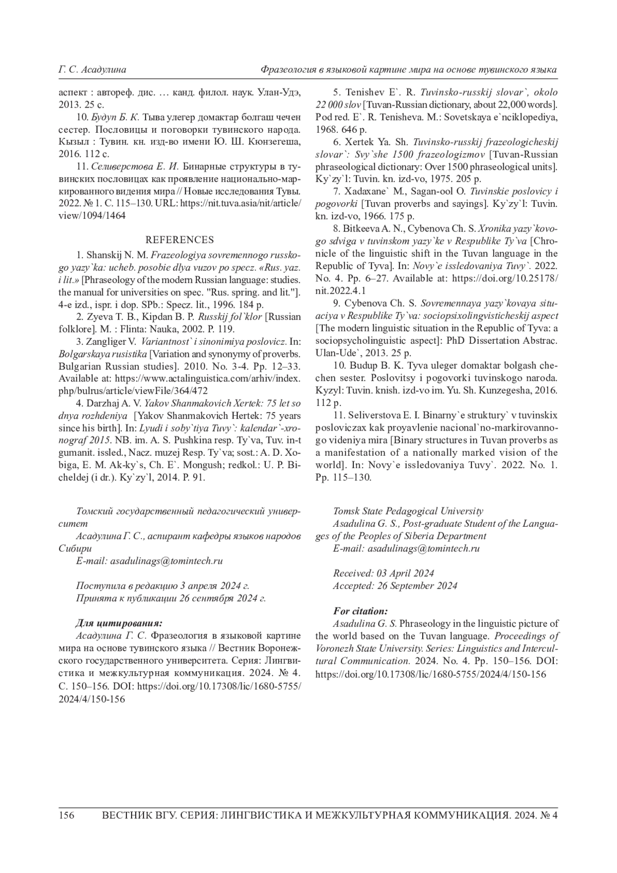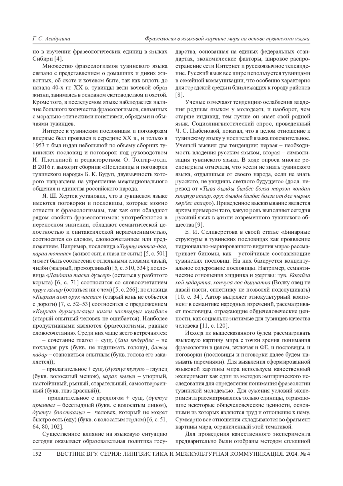 11. Селиверстова Е. И. Бинарные структуры в тувинских пословицах как проявление национально-маркированного видения мира//Новые исследования Тувы. 2022. № 1. С. 115-130. URL: https://nit.tuva.asia/nit/article/view/1094/1464. EDN: WNWGKA