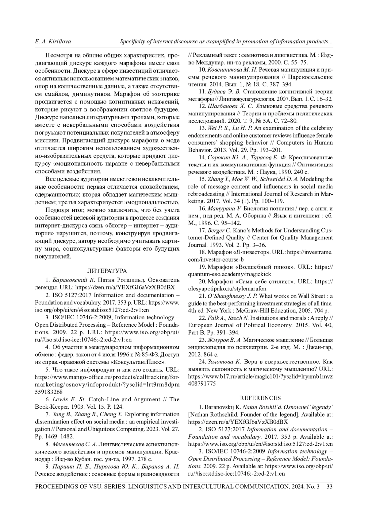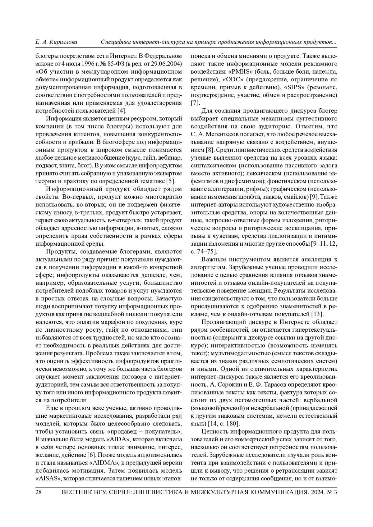 КИРИЛЛОВА Е. А. СПЕЦИФИКА ИНТЕРНЕТ-ДИСКУРСА НА ПРИМЕРЕ ПРОДВИЖЕНИЯ ИНФОРМАЦИОННЫХ ПРОДУКТОВ В ТЕМАТИЧЕСКИХ БЛОГАХ // ВЕСТНИК ВОРОНЕЖСКОГО ГОСУДАРСТВЕННОГО УНИВЕРСИТЕТА. СЕРИЯ: ЛИНГВИСТИКА И МЕЖКУЛЬТУРНАЯ КОММУНИКАЦИЯ. 2024. № 3