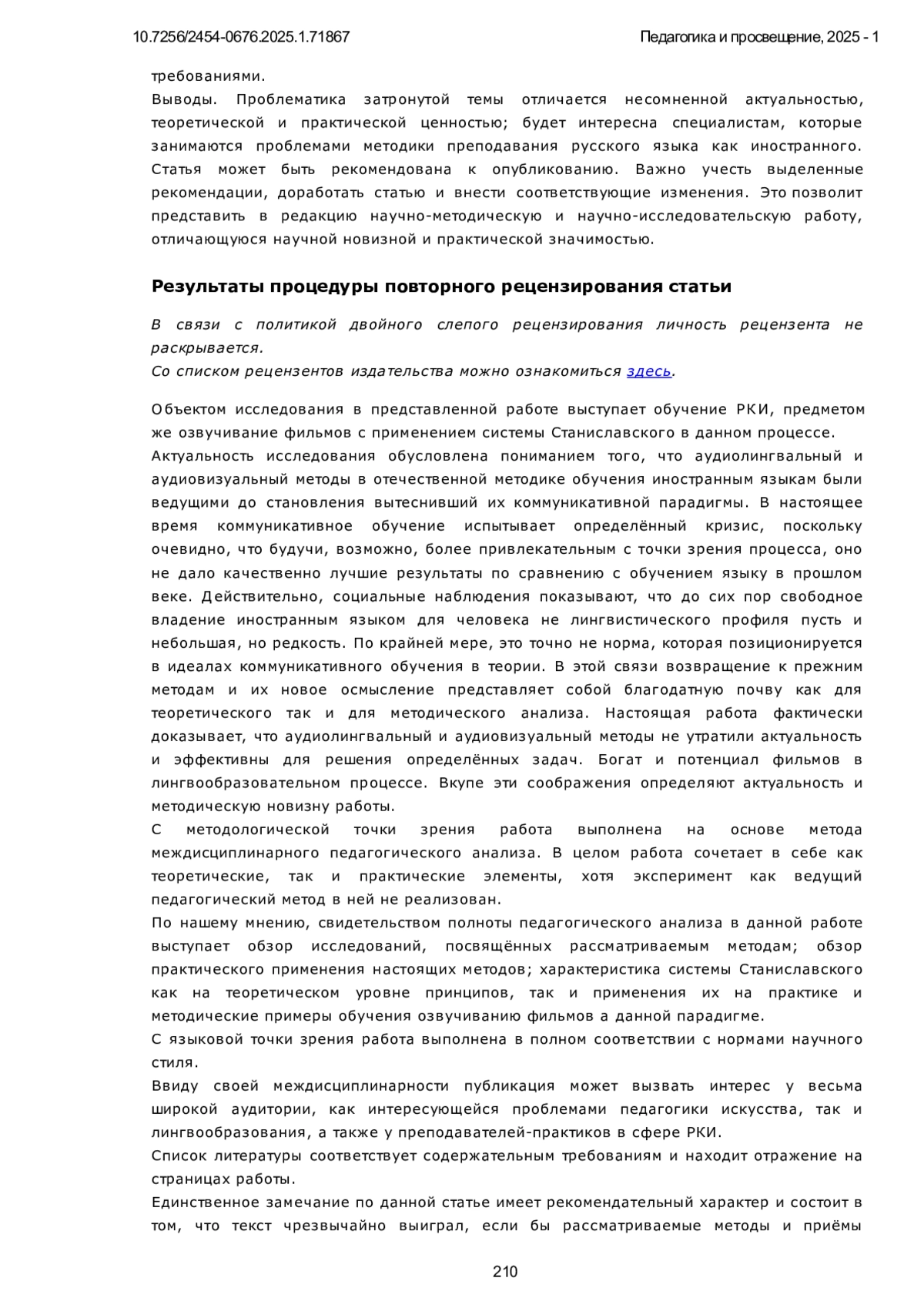 В методике преподавания русского языка как иностранного на сегодняшний день для такого явления, как озвучивание художественных фильмов и мультфильмов, методический статус фактически не определен. Данный приём, который может быть применен в широких лингводидактических целях — от постановки звуков до творческого говорения, — отсутствует не только в учебниках или методических разработках, но не описан и в специальной литературе — например, в словаре терминов Э. Г. Азимова и А. Н. Щукина [1]. А в разработках ученых М. А. Ефремовой, И. А. Королевой, Л. П. Мухина [2, 3], где фигурирует переозвучивание аудиовизуальных материалов, озвучивание позиционируется как способ «научить /инофонов/ подражать аутентичным образцам устноречевых высказываний» [2, с. 28–29], что, на наш взгляд, лишает его творческой составляющей и не раскрывает его огромный потенциал. Таком образом, озвучивание в РКИ есть одно из упражнений, применяемых в рамках аудиовизуального или аудиолингвального методов обучения, причем не самым востребованным упражнением, поскольку основывается он на механическом копировании речи носителей языка.