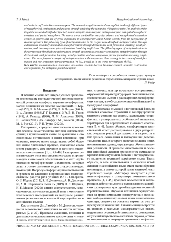 Словарный состав современного корейского языка (южнокорейский вариант) активно пополняется англицизмами в условиях интенсивного языкового контакта. Как правило, в процессе заимствования происходит семантическое сужение, а затем в процессе усвоения и адаптации англицизма в корейском языке и культуре происходит расширение его семантического значения, в том числе за счет механизмов метафоризации. Новые слова и концепты из английского языка подвергаются переосмыслению в рамках концептуальной системы и метафорического мышления корейского народа. Материалом исследования послужил корпус из 387разноструктурных метафорических единиц, полученных методом сплошной выборки из толковых словарей корейского языка, сборников неологизмов корейского языка за шесть лет с 2017 по 2022 г., а также сайтов южнокорейских газет. Для описания и анализа отобранного языкового материала был применен семантико-когнитивный метод с целью выявления разных типов метафорических номинаций и моделей через анализ семантики языковых единиц. В рамках анализа языкового материала были выявлены артефактная, природоморфная, социоморфная, антропоморфная и пространственная метафоры; полные и частичные метафоры. Областью-источником являются привычные бытовые сферы, а метафорическая экспансия происходит в сферы, которые имеют большое значение в современном корейском обществе с точки зрения носителей корейского языка. Были выявлены следующие виды метафоризации в корпусе: метафоризация в ходе автономной вторичной номинации, метафоризация в ходе деривативного словообразования и образования слов-портмоне, словосложения и двухкомпонентного фразообразования с участием англицизмов. Были выявлены следующие виды метафоризации в корпусе: метафоризация в ходе автономной вторичной номинации, метафоризация в ходе деривативного словообразования, образования слов-портмоне, словосложения и двухкомпонентного фразообразования с участием англицизмов. Наиболее часто встречающимися в корпусе являются примеры метафоризации, возникающей в ходе словосложения и двухкомпонентного фразообразования (46 %), а таже в словах-портмоне (38 %).