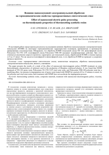 В настоящей работе представлены результаты исследования влияния обработки наносекундными электромагнитными импульсами (НЭМИ) на некоторые термодинамические характеристики полимеров, применяемых в производстве армированных стеклопластиков. Обнаружено, что обработка НЭМИ эпоксидной смолы YD-128, винилэфирной смолы Polysystem VE-3701 LVP, полиэфирной смолы Polysystem YMI-100 оказывает модифицирующее действие. При этом отмечается увеличение скорости пропитки, характерное для эпоксидной смолы, обработанной НЭМИ в течение периода от 0 до 15 минут. Что же касается полиэфирной и винилэфирной смол, то их обработка НЭМИ не приводит к ускорению процесса пропитки.