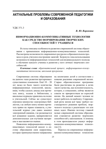 1. Кудрань В. А. Специфика развития творческих способностей подростков в условиях применения информационных технологий // Педагогический журнал. 2019. Т. 9. № 1-1. С. 290 - 298.