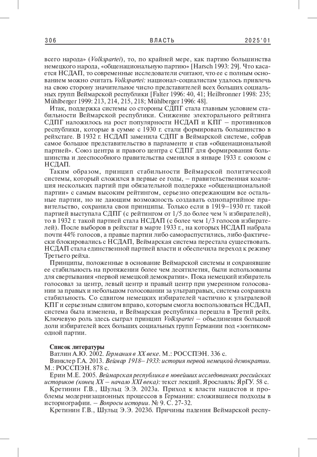 5. Кретинин Г.В., Шульц Э.Э. 2023б. Причины падения Веймарской республики: проблемные вопросы историографии. - Вопросы истории. № 8. С. 62-71.
