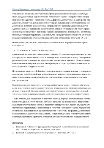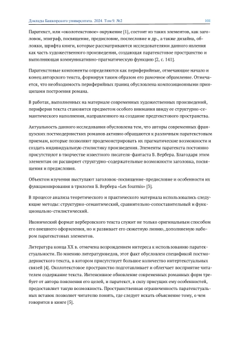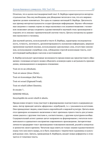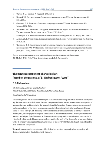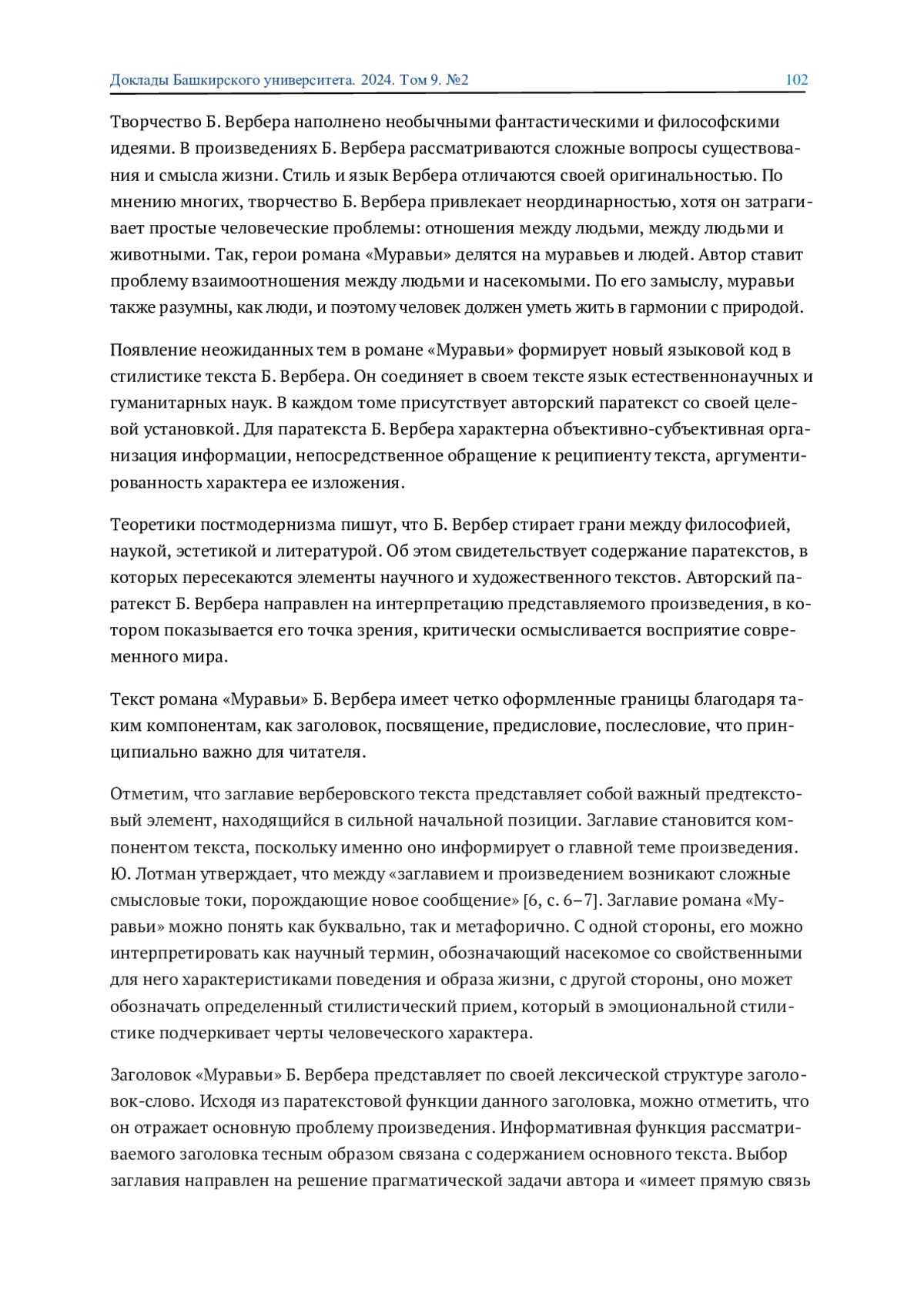 КУДРЯШЕВА Ф. С. ПАРАТЕКСТОВАЯ СОСТАВЛЯЮЩАЯ ХУДОЖЕСТВЕННОГО ПРОИЗВЕДЕНИЯ (НА МАТЕРИАЛЕ РОМАНА Б. ВЕРБЕРА "МУРАВЬИ") // ДОКЛАДЫ БАШКИРСКОГО УНИВЕРСИТЕТА. 2024. Т. 9 № 2