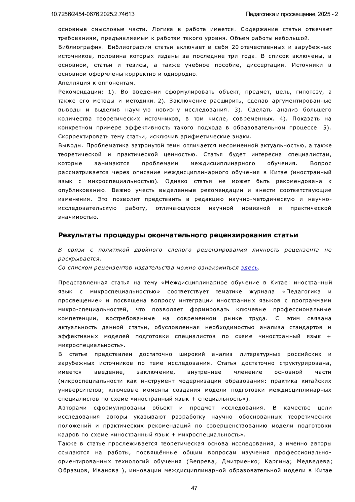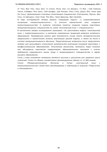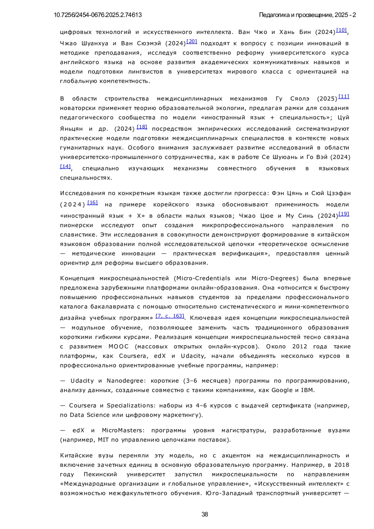 11. Гу Сяолэ. Исследование построения междисциплинарного педагогического сообщества по модели “иностранный язык + специальность” с точки зрения экологии образования // Иностранные языки в мире. 2025. № 1. С. 73-80. (顾晓乐. 教育生态视域下“外语+专业“跨学科教学共同体构建研究[J]. 外语界). 2025. № (1). С. 73-80.