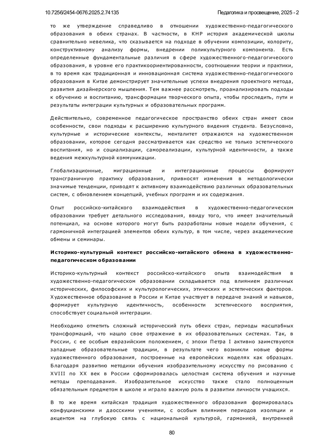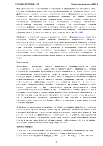 Статья посвящена анализу российско-китайского сотрудничества в сфере художественно-педагогического образования в условиях современной глобализации и ускоренной цифровизации. Исследуются ключевые исторические, культурные и педагогические аспекты взаимодействия двух крупнейших стран, включая влияние классической советской системы образования на китайскую художественную школу, также актуальные современные тенденции, такие как интеграция цифровых технологий и искусственного интеллекта, междисциплинарные подходы и кросс-культурные исследования, академические обмены и стажировки. Особое внимание уделено детальному сравнительному анализу педагогических практик России и Китая, системному выявлению их сильных сторон и конкретным возможностям для взаимного обогащения. Авторы рассматривают, как традиционные методы обучения органично сочетаются с инновационными подходами, также как культурные различия непосредственно влияют на формирование современных образовательных стратегий. В работе методы историко-культурного анализа, сравнительной педагогики, а также практико-ориентированный подход, включающий разработку учебных программ и экспериментальное обучение. Исследование опирается на анализ академических публикаций, образовательных стандартов и реального опыта совместных проектов между российскими и китайскими вузами. Научная новизна исследования заключается в комплексном изучении и анлизе российско-китайского сотрудничества в области художественно-педагогическом образовании на современном этапе, включая разработку адаптированных учебных планов и программ и критериев оценки. Авторы приходят к выводу, что интеграция традиционных и инновационных методов, а также системное усиление академических обменов способствуют формированию мультикультурной образовательной среды в условиях цифровой трансформации. Однако сохраняются вызовы, такие как сложный баланс между традициями и модернизацией на практике, а также острая необходимость дальнейшей цифровизации. Перспективы развития очевидно включают расширение совместных программ, использование VR/AR-технологий и укрепление междисциплинарных связей в педагогический процесс. Дальнейшие исследования в области интеграции российских и китайских педагогических практик помогут глубже изучить механизмы культурного обмена и его влияния на обогащение художественного образования обеих стран, цель которого - как развить значимые профессиональные компетенции, так и укрепить социокультурную идентичность будущих специалистов. Тем важнее для обеих стран продолжение диалога культур в рамках новых форматов сотрудничества, чтобы успешно отвечать на вызовы, связанные с интернационализацией сферы образования.