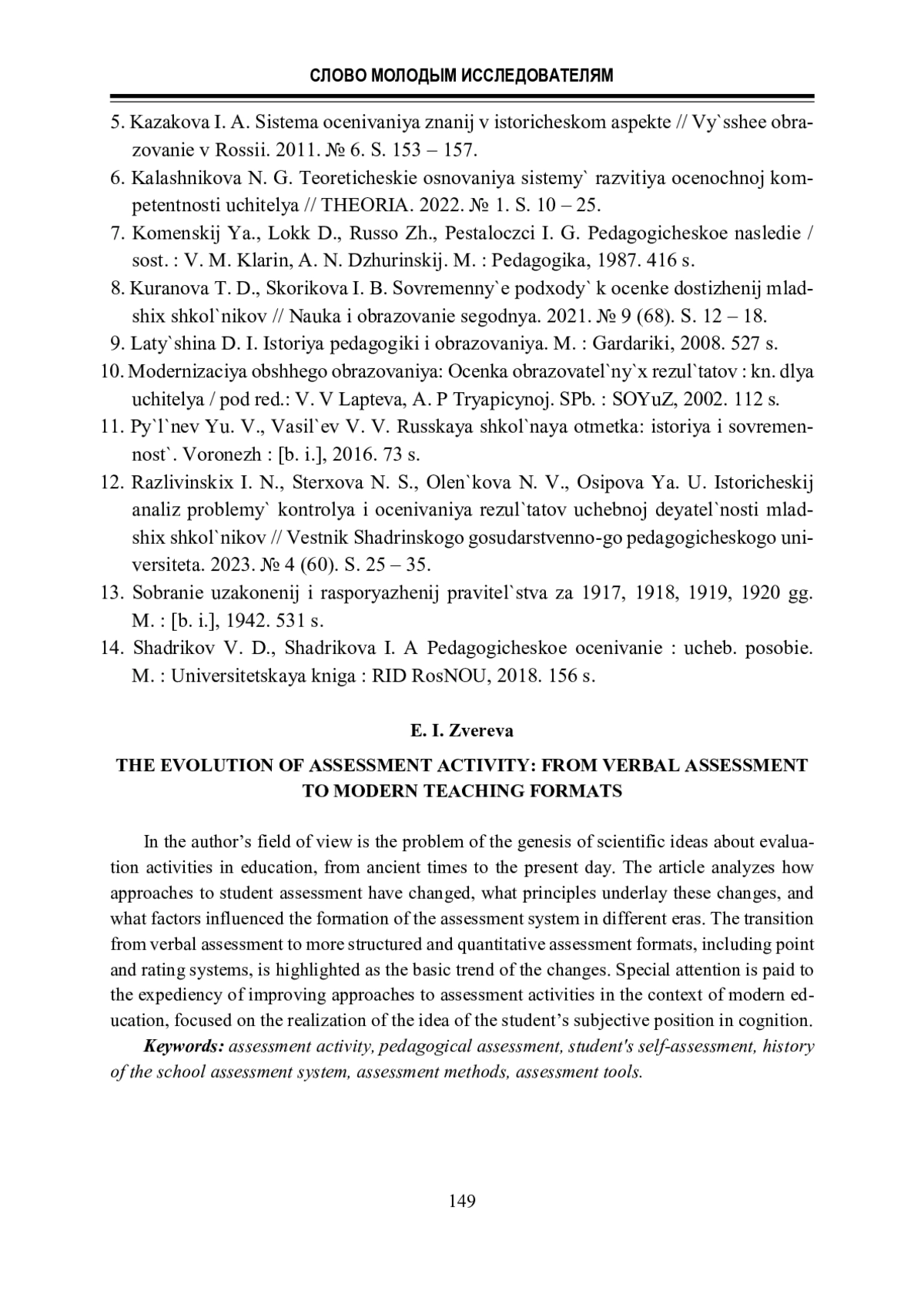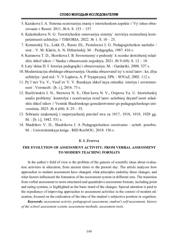 ЗВЕРЕВА Е. И. ЭВОЛЮЦИЯ ОЦЕНОЧНОЙ ДЕЯТЕЛЬНОСТИ: ОТ СЛОВЕСНОЙ ОЦЕНКИ К СОВРЕМЕННЫМ ФОРМАТАМ В ОБУЧЕНИИ // ВЕСТНИК ВЛАДИМИРСКОГО ГОСУДАРСТВЕННОГО УНИВЕРСИТЕТА ИМ. АЛЕКСАНДРА ГРИГОРЬЕВИЧА И НИКОЛАЯ ГРИГОРЬЕВИЧА СТОЛЕТОВЫХ. СЕРИЯ: ПЕДАГОГИЧЕСКИЕ И ПСИХОЛОГИЧЕСКИЕ НАУКИ. 2025. №1 (79)