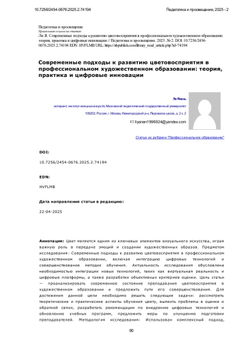 Цвет является одним из ключевых элементов визуального искусства, играя важную роль в передаче эмоций и создании художественных образов. Предметом исследования: Современные подходы к развитию цветовосприятия в профессиональном художественном образовании, включая интеграцию цифровых технологий и совершенствование методик обучения. Актуальность исследования обусловлена необходимостью интеграции новых технологий, таких как виртуальная реальность и цифровые платформы, а также разработки объективных критериев оценки. Цель статьи - проанализировать современное состояние преподавания цветовосприятия в художественном образовании и предложить пути его совершенствования. Для достижения данной цели необходимо решить следующие задачи: рассмотреть теоретические и практические аспекты обучения цвету, выявить проблемы в оценке и обратной связи, разработать рекомендации по внедрению цифровых технологий и обновлению учебных программ, предложить меры по улучшению подготовки преподавателей. Методология исследования: Использован комплексный подход, включающий теоретический анализ научной литературы по проблеме цветовосприятия, сравнительное исследование традиционных и современных методов обучения, анализ практического опыта внедрения цифровых технологий в образовательный процесс. Особое внимание уделено изучению опыта китайских учебных заведений в данной области. Новизна исследования, выводы: В данной статье дан системный анализ современного состояния и существующих проблем в сфере развития цветовосприятия в профессиональном художественном образовании, а также показана важная роль цвета как интуитивного и выразительного визуального языка в творчестве и преподавании искусства. Впервые выполнен комплексный анализ современных методов обучения цветовосприятию с учетом цифровых инноваций. Разработаны практические рекомендации по модернизации учебных программ, внедрению цифровых технологий и совершенствованию системы оценки для китайских художественных учебных заведений. Показана эффективность сочетания традиционной теории цвета с современными концепциями дизайна и применением цифровых платформ. Полученные результаты могут быть использованы в художественных школах и вузах различных стран для повышения качества подготовки специалистов в области визуальных искусств.