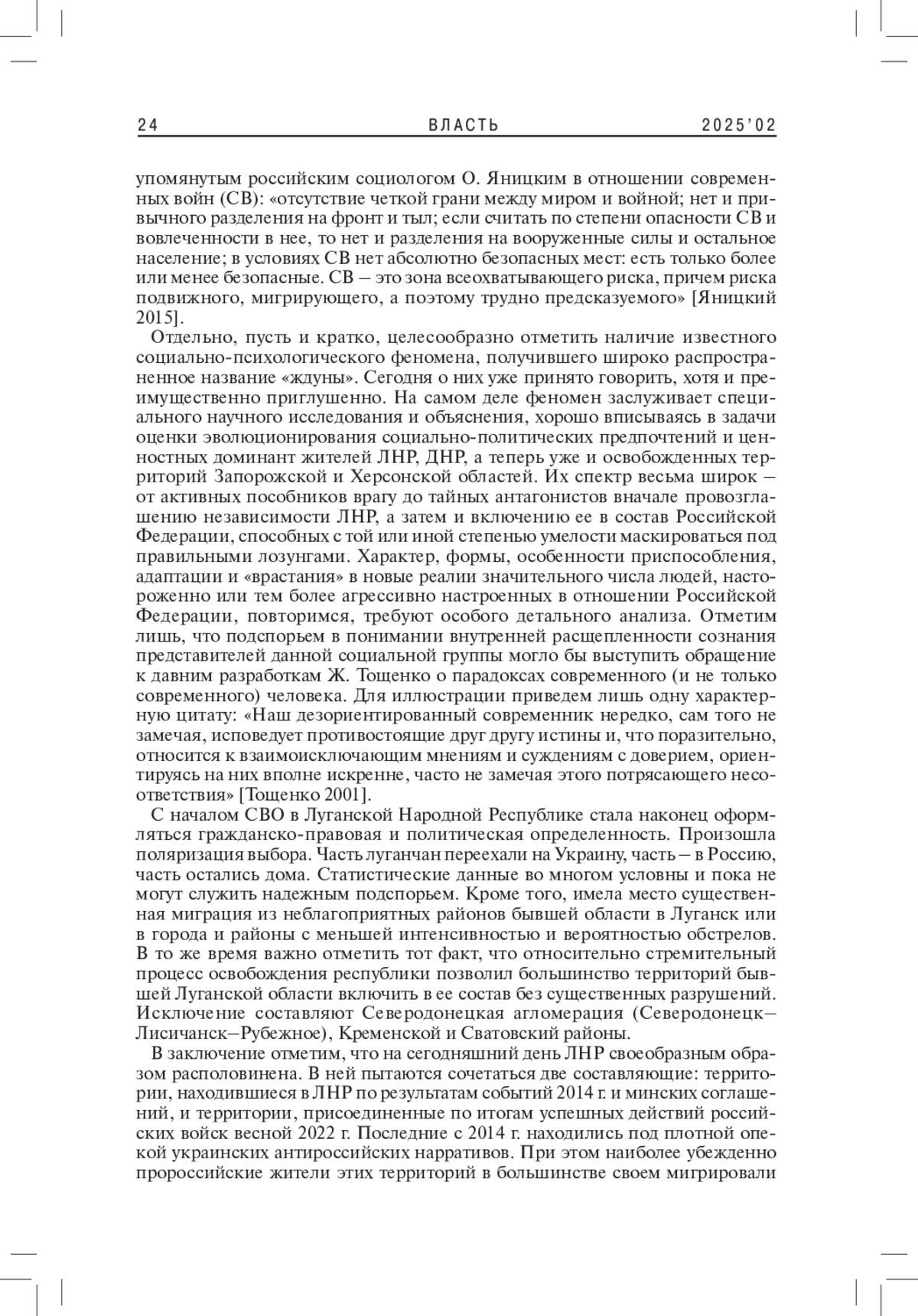 5. Яницкий О.Н. 2015. Современные войны: взгляд социолога. - Социологические исследования. № 5. С. 156-164. EDN: TUHQZR