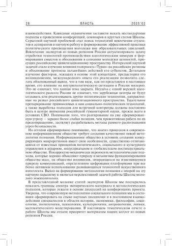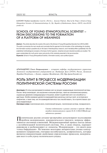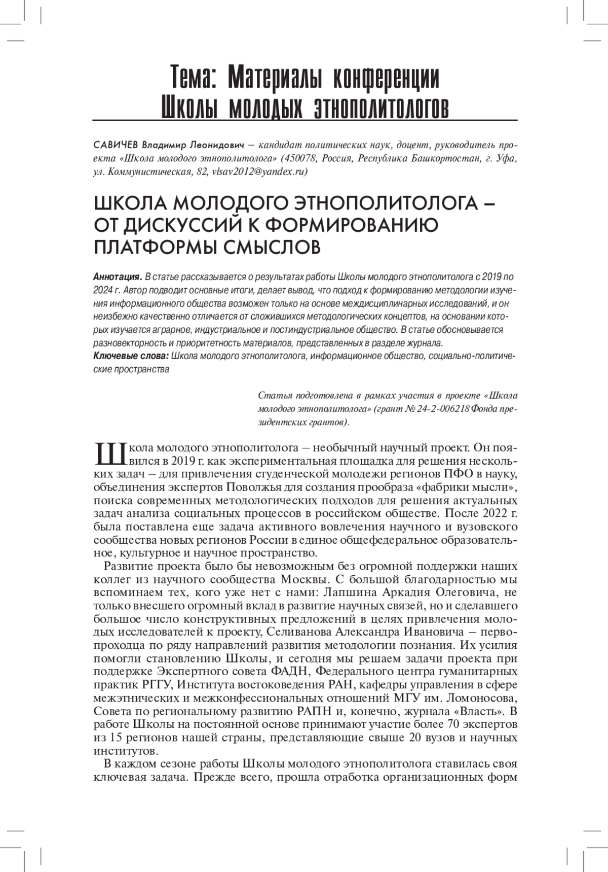 САВИЧЕВ В. Л. ШКОЛА МОЛОДОГО ЭТНОПОЛИТОЛОГА - ОТ ДИСКУССИЙ К ФОРМИРОВАНИЮ ПЛАТФОРМЫ СМЫСЛОВ // ВЛАСТЬ. 2025. ТОМ 33 № 2