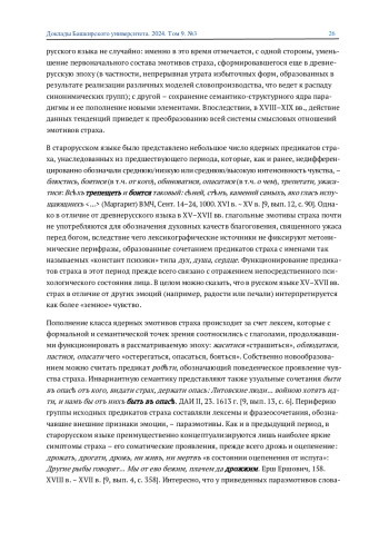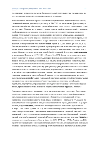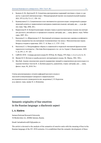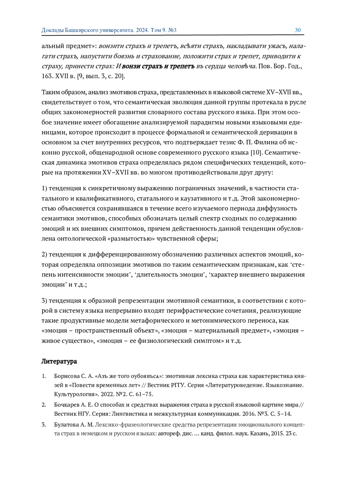 КИСЕЛЕВА Л. А. СЕМАНТИЧЕСКОЕ СВОЕОБРАЗИЕ ЭМОТИВОВ СТРАХА В РУССКОМ ЯЗЫКЕ: ДИАХРОНИЧЕСКИЙ АСПЕКТ // ДОКЛАДЫ БАШКИРСКОГО УНИВЕРСИТЕТА. 2024. Т. 9 № 3