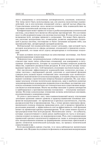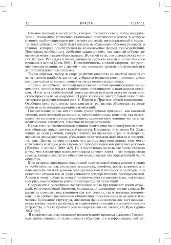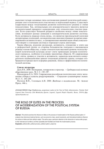 АПАНАЩЕНКО О. В. РОЛЬ ЭЛИТ В ПРОЦЕССЕ МОДЕРНИЗАЦИИ ПОЛИТИЧЕСКОЙ СИСТЕМЫ РОССИИ // ВЛАСТЬ. 2025. ТОМ 33 № 2