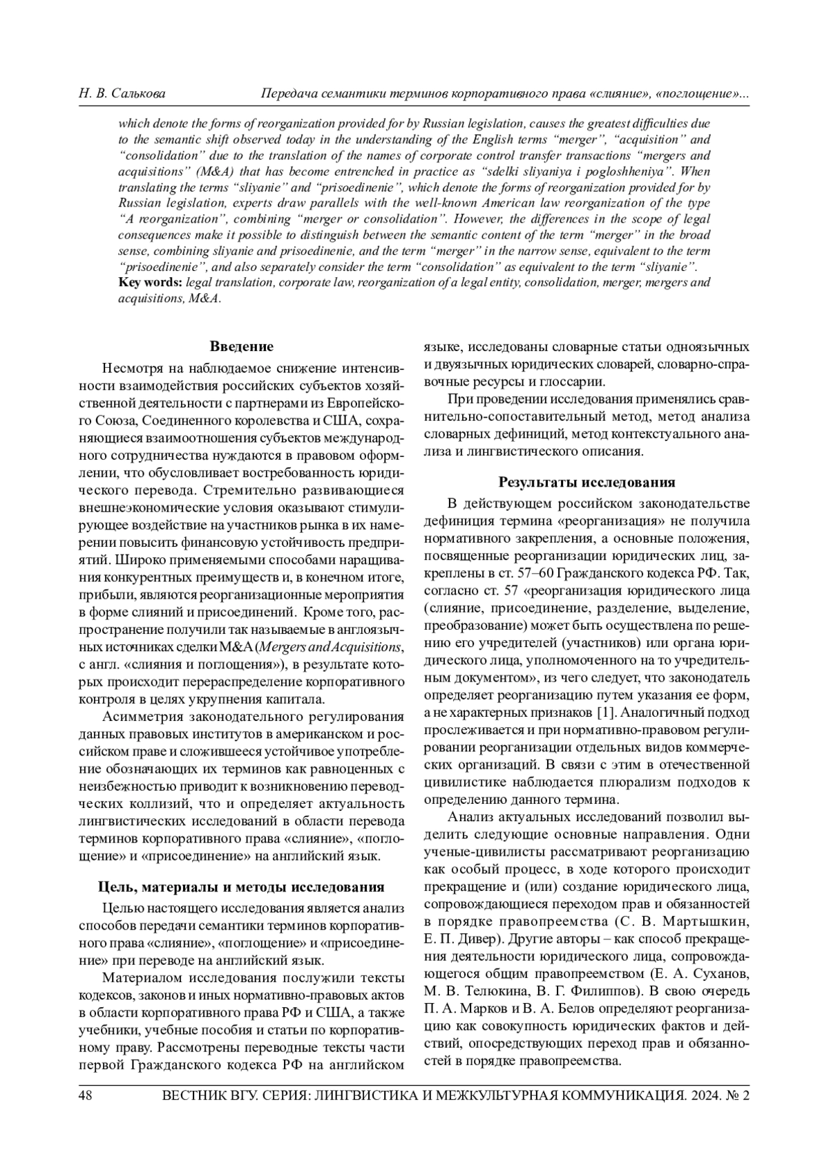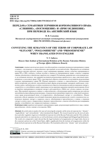Статья имеет целью анализ способов передачи семантики терминов корпоративного права «слияние», «поглощение» и «присоединение» при переводе на английский язык. Материалом исследования послужили тексты кодексов, законов и иных нормативно-правовых актов в области корпоративного права РФ и США, учебники, учебные пособия и статьи по корпоративному праву, а также словарные статьи одноязычных и двуязычных юридических словарей. Результаты сравнительно-сопоставительного исследования показали, что правовой институт реорганизации юридического лица, известный корпоративному и налоговому праву США, существенным образом отличается от института реорганизации в рамках корпоративного права РФ. Перевод терминов «слияние» и «присоединение», обозначающих предусмотренные российским законодательством формы реорганизации, вызывает наибольшие сложности в связи с наблюдаемым сегодня семантическим сдвигом в понимании английских терминов «merger», «acquisition» и «consolidation» ввиду закрепившегося на практике варианта перевода наименования сделок по передаче корпоративного контроля «mergers and acquisitions» (M&A) как «сделки слияния и поглощения». При переводе терминов «слияние» и «присоединение», обозначающих предусмотренные российским законодательством формы реорганизации, специалистами проводятся параллели с известной американскому праву реорганизацией типа «A reorganization», объединяющей «merger or consolidation». Однако различия в объеме правовых последствий позволяют провести разграничение между семантическим наполнением термина «merger» в широком смысле, объединяющего присоединение и слияние, и термина «merger» в узком смысле, эквивалентного термину «присоединение», а также обособленно рассматривать термин «consolidation» как эквивалент термина «слияние».