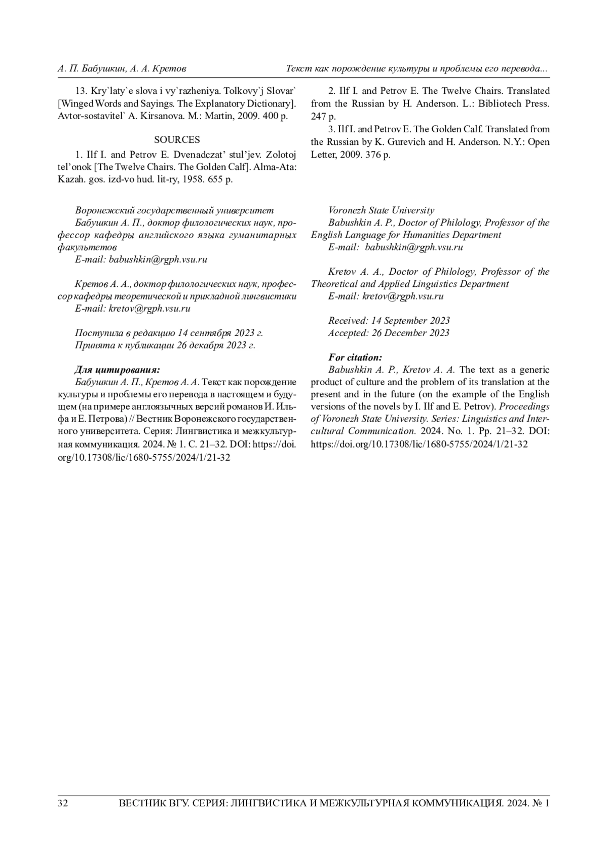 Статья посвящена анализу художественного текста как культурного явления, а также восприятию этого текста в координатах «чужой» культуры. Авторы обращаются к переводам на английский язык текстовых аллюзий в романах И. Ильфа и Е. Петрова «Двенадцать стульев» и «Золотой теленок», понимая под словом «аллюзия» мысленную отсылку читателя к культурным событиям реальной жизни, произведениям литературы и искусства, включая в рамки последнего и музыку. В результате объектом разбора становятся аллюзии четырех типов: событийные, литературные, художественноизобразительные и музыкальные. Перевод аллюзий на английский язык (и часто практикуемый обратный перевод) свидетельствует о том, что все эти отсылки в основном утрачивают свой культурный потенциал, подвергаясь перефразировке или искажению. Особое внимание в работе уделяется музыкальным аллюзиям. Если текст песни можно перевести с одного языка на другой, то в традиционном бумажном формате его музыкальное сопровождение оказывается непереводимым. Авторы предлагают революционизировать формат перевода. Благодаря информационным технологиям сегодня активизируются электронные и аудиокниги, в которых вполне реально использовать не только музыкальные аллюзии, но и визуальные. Интерес представляет обращение к языковой личности главного героя повествования, так как ранее фигура Остапа Бендера с этих позиций не изучалась.