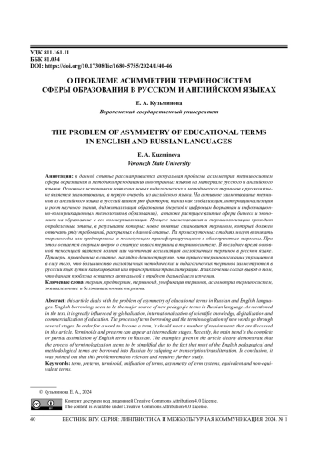 В данной статье рассматривается актуальная проблема асимметрии терминосистем сферы образования и методики преподавания иностранных языков на материале русского и английского языков. Основным источником появления новых педагогических и методических терминов в русском языке является заимствование, в первую очередь, из английского языка. На активное заимствование терминов из английского языка в русский влияет ряд факторов, таких как глобализация, интернационализация и рост научного знания, диджитализация образования (переход к цифровым форматам и информационно-коммуникационным технологиям в образовании), а также растущее влияние сферы бизнеса и экономики на образование и его коммерциализация. Процесс заимствования и терминологизации проходит определенные этапы, в результате которых новое понятие становится термином, который должен отвечать ряду требований, раскрытых в данной статье. На промежуточных стадиях могут возникать терминоиды или предтермины, в последующем трансформирующиеся в общепринятые термины. При этом остается спорным вопрос о статусе нового термина в терминосистеме. В последнее время основной тенденцией является полная или частичная ассимиляция англоязычных терминов в русском языке. Примеры, приведенные в статье, наглядно демонстрируют, что процесс терминологизации упрощается в силу того, что большинство англоязычных методических и педагогических терминов заимствуются в русский язык путем калькирования или транскрипции/транслитерации. В заключении сделан вывод о том, что данная проблема остается актуальной и требует дальнейшего изучения.