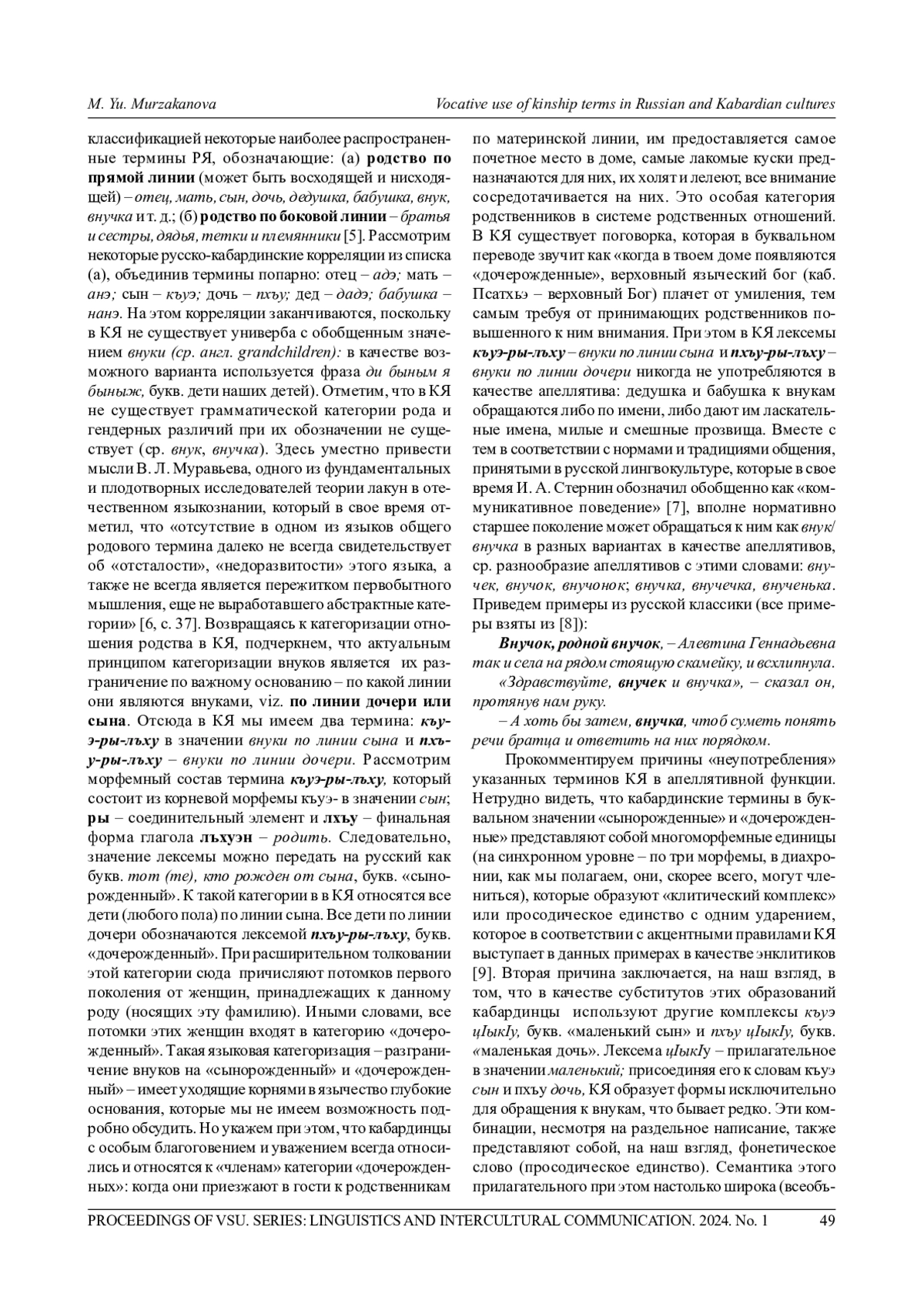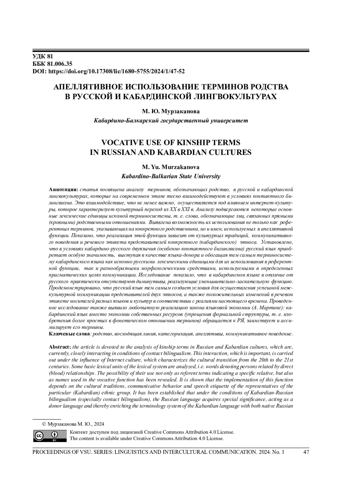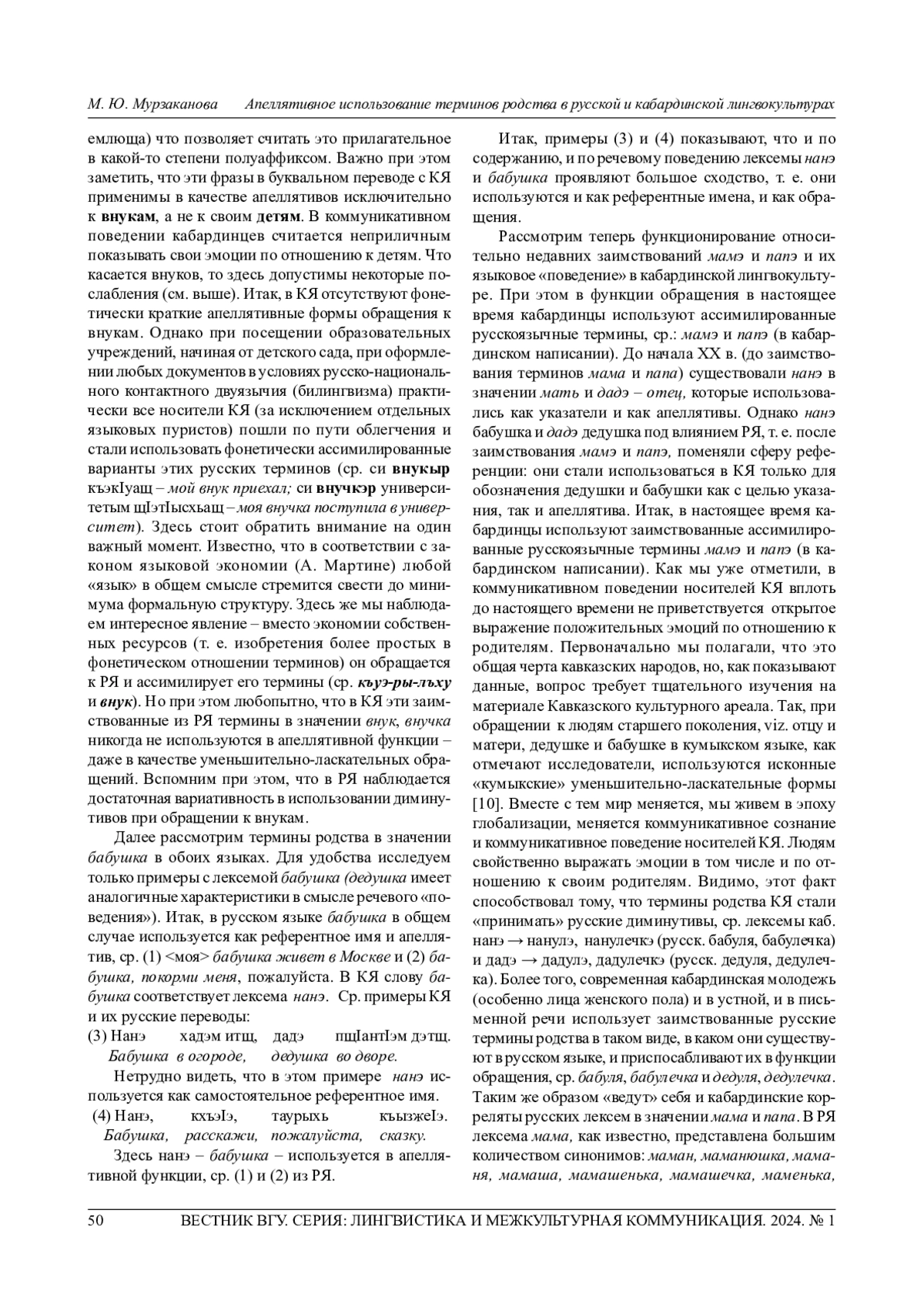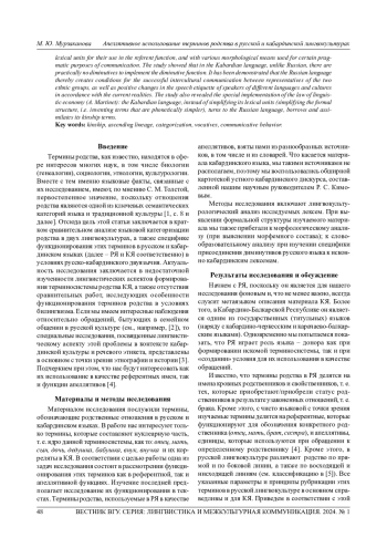 Статья посвящена анализу терминов, обозначающих родство, в русской и кабардинской лингвокультурах, которые на современном этапе тесно взаимодействуют в условиях контактного билингвизма. Это взаимодействие, что не менее важно, осуществляется под влиянием интернет-культуры, которое характеризует культурный переход изXX в XXI в. Анализу подвергаются некоторые основные лексические единицы искомой терминосистемы, т. е. слова, обозначающие лиц, связанных прямыми (кровными) родственными отношениями. Выявлена возможность их использования не только как референтных терминов, указывающих на конкретного родственника, но и имен, используемых в апеллятивной функции. Показано, что реализация этой функции зависит от культурных традиций, коммуникативного поведения и речевого этикета представителей конкретного (кабардинского) этноса. Установлено, что в условиях кабардино-русского двуязычия (особенно контактного билингвизма) русский язык приобретает особую значимость, выступая в качестве языка-донора и обогащая тем самым терминосистему кабардинского языка как исконно русскими лексическими единицами для их использования в референтной функции, так и разнообразными морфологическими средствами, используемыми в определенных прагматических целях коммуникации. Исследование показало, что в кабардинском языке в отличие от русского практически отсутствуют диминутивы, реализующие уменьшительно-ласкательную функцию. Продемонстрировано, что русский язык тем самым создает условия для осуществления успешной межкультурной коммуникации представителей двух этносов, а также положительных изменений в речевом этикете носителей разных языков и культур в соответствии с реалиями настоящего времени. Проведенное исследование также выявило любопытную реализацию закона языковой экономии (А. Мартине): кабардинский язык вместо экономии собственных ресурсов (упрощения формальной структуры, т. е. изобретения более простых в фонетическом отношении терминов) обращается к РЯ, заимствует и ассимилирует его термины.