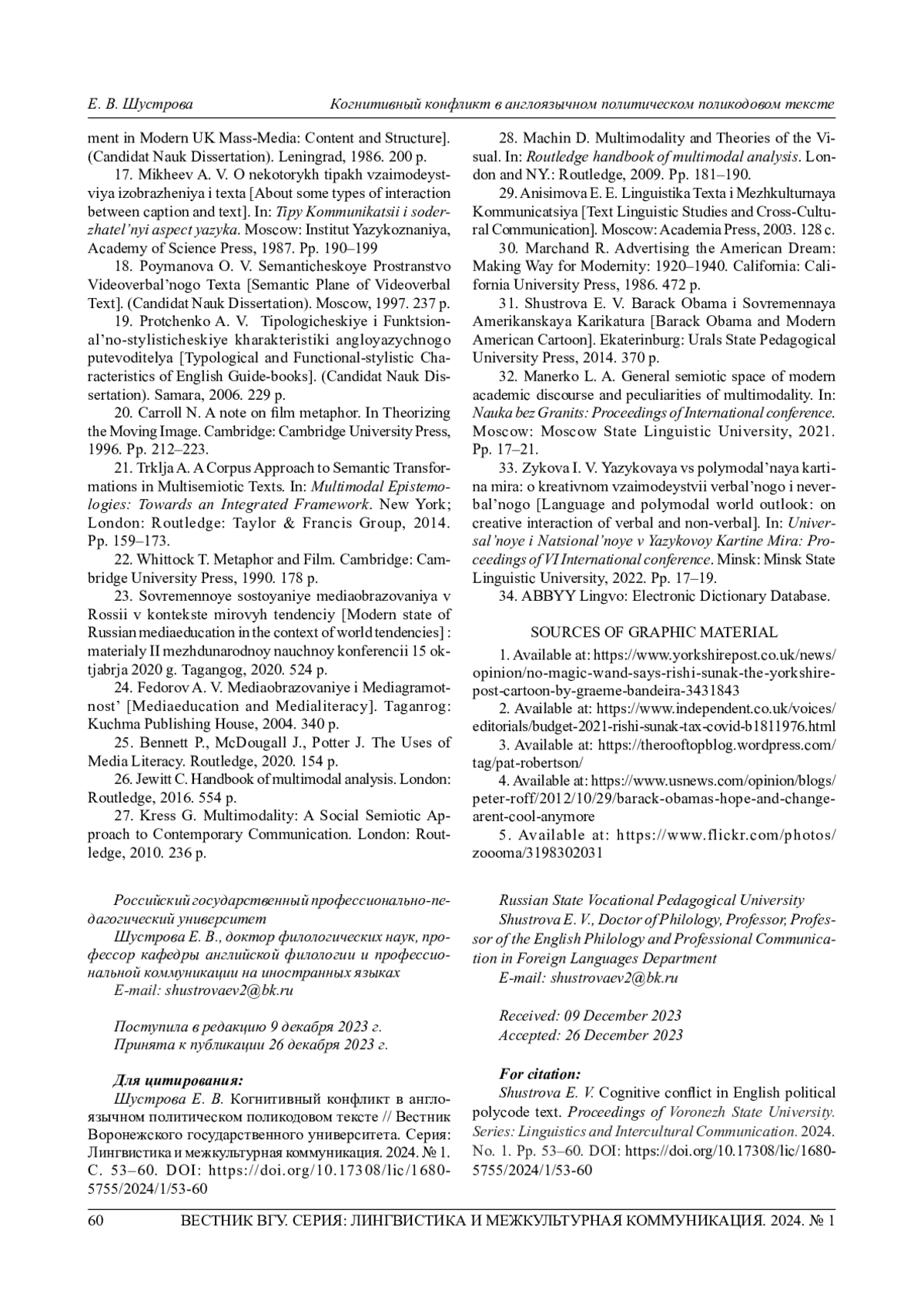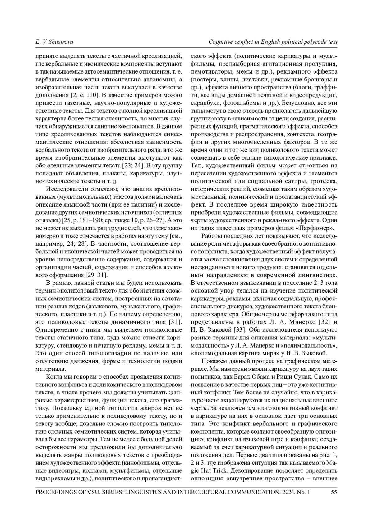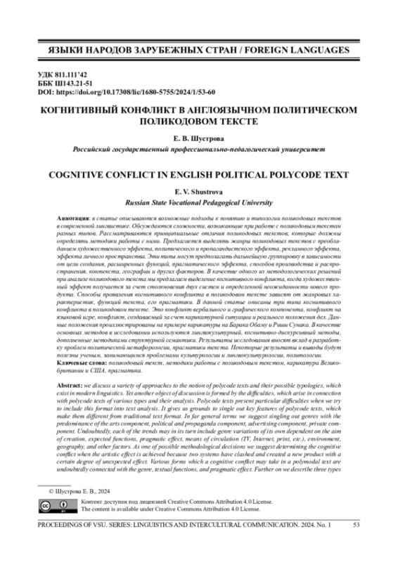 В статье описываются возможные подходы к понятию и типологии поликодовых текстов в современной лингвистике. Обсуждаются сложности, возникающие при работе с поликодовым текстом разных типов. Рассматриваются принципиальные отличия поликодовых текстов, которые должны определять методики работы с ними. Предлагается выделять жанры поликодовых текстов с преобладанием художественного эффекта, политического и пропагандистского эффекта, рекламного эффекта, эффекта личного пространства. Эти типы могут предполагать дальнейшую группировку в зависимости от цели создания, расширенных функций, прагматического эффекта, способов производства и распространения, контекста, географии и других факторов. В качестве одного из методологических решений при анализе поликодового текста мы предлагаем выделение когнитивного конфликта, когда художественный эффект получается за счет столкновения двух систем и определенной неожиданности нового продукта. Способы проявления когнитивного конфликта в поликодовом тексте зависят от жанровых характеристик, функций текста, его прагматики. В данной статье описаны три типа когнитивного конфликта в поликодовом тексте. Это конфликт вербального и графического компонента, конфликт на языковой игре, конфликт, создаваемый за счет карикатурной ситуации и реального положения дел. Данные положения проиллюстрированы на примере карикатуры на Барака Обаму и Риши Сунака. В качестве основных методов в исследовании используются лингвокультурный, когнитивно-дискурсивный методы, дополненные методиками структурной семантики. Результаты исследования вносят вклад в разработку проблем политической метафорологии, прагматики текста. Некоторые результаты и выводы будут полезны ученым, занимающимся проблемами культурологии и лингвокультурологии, политологии.