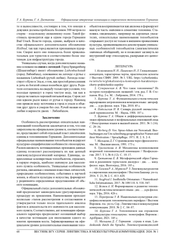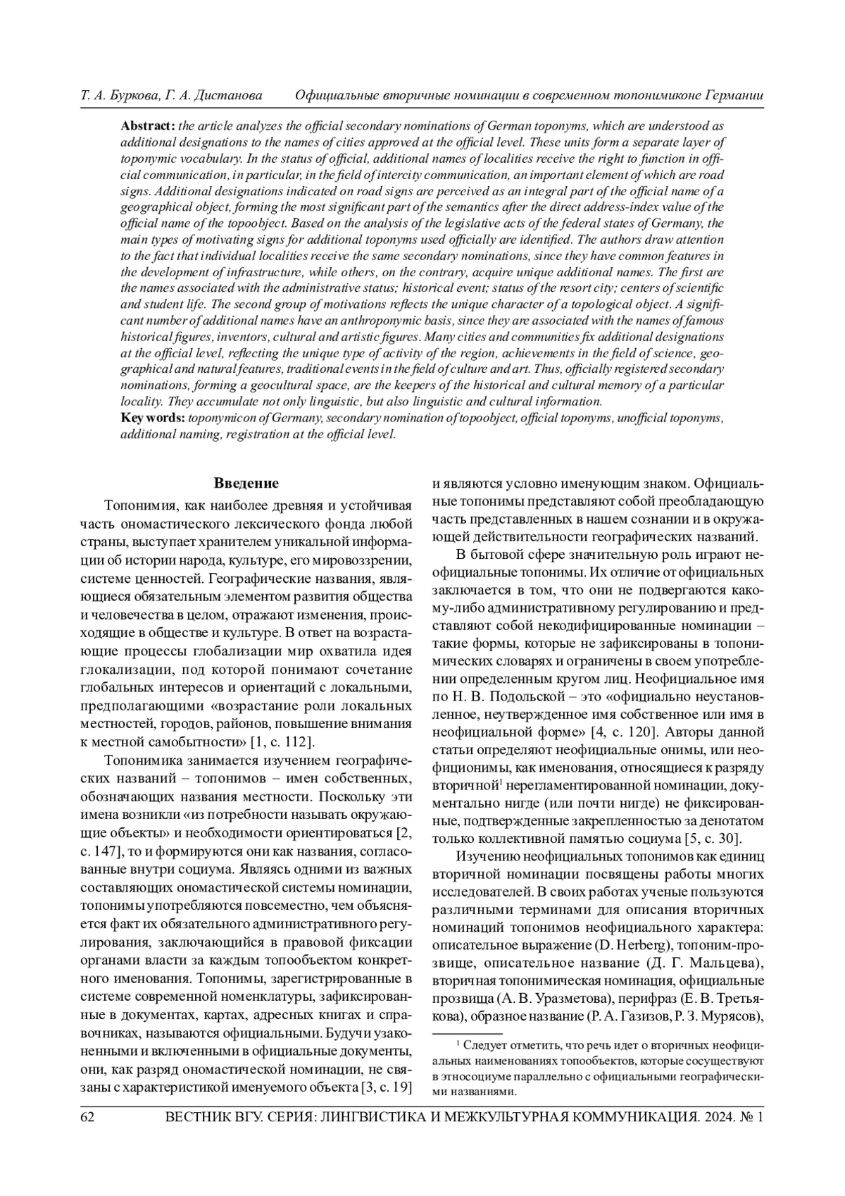 В статье анализируются официальные вторичные номинации топонимов Германии, под которыми понимаются дополнительные обозначения к названиям городов, утверждаемые на официальном уровне. Данные единицы формируют отдельный пласт топонимической лексики. В статусе официальных дополнительные именования населенных пунктов получают право функционировать в официальной коммуникации, в частности, в сфере междугородного сообщения, важным элементом которой являются дорожные указатели. Неотъемлемой частью официального наименования географического объекта являются дополнительные обозначения, представленные на дорожных указателях Германии, которые часто формируют наиболее значимую часть семантики после прямого адресно-указательного значения официального наименования топообъекта. Анализ законодательных актов федеральных земель Германии позволил выделить две группы мотивирующих признаков, которые легли в основу номинации дополнительных обозначений топообъектов, используемых официально. К первой группе были отнесены так называемые повторяющиеся признаки, связанные с административным статусом топообъекта, историческим событием, статусом города-курорта, центром научной и студенческой жизни. Значительное количество дополнительных именований топообъектов имеет антропонимическую основу, поскольку связано с именами известных исторических личностей, изобретателей, деятелей культуры и искусства. Вторая группа мотивации носит единичный уникальный характер топообъекта. В данном случае города и общины закрепляют на официальном уровне дополнительные обозначения, отражающие уникальный вид деятельности региона, достижения в области науки, географические и природные особенности, традиционные мероприятия в области культуры и искусства. Отдельные населенные пункты получают одинаковые вторичные номинации, поскольку имеют общие особенности в развитии инфраструктуры, другие, наоборот, приобретают уникальные дополнительные именования. Официально зарегистрированные вторичные номинации, формируя геокультурное пространство, являются хранителями исторической и культурной памяти конкретного населенного пункта. Они аккумулируют в себе лингвистическую, энциклопедическую и лингвострановедческую информацию.