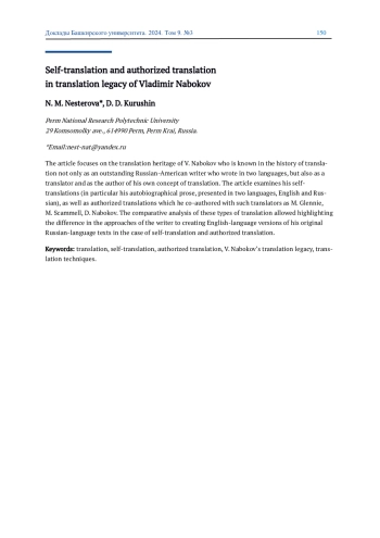 Интерес к переводческому наследию В. Набокова, уникального писателя-билингва, сегодня огромен, и это вполне закономерно. Он, действительно, оставил след во всех видах литературного перевода: традиционного межъязыкового перевода, автоперевода, авторизованного перевода и псевдоперевода.