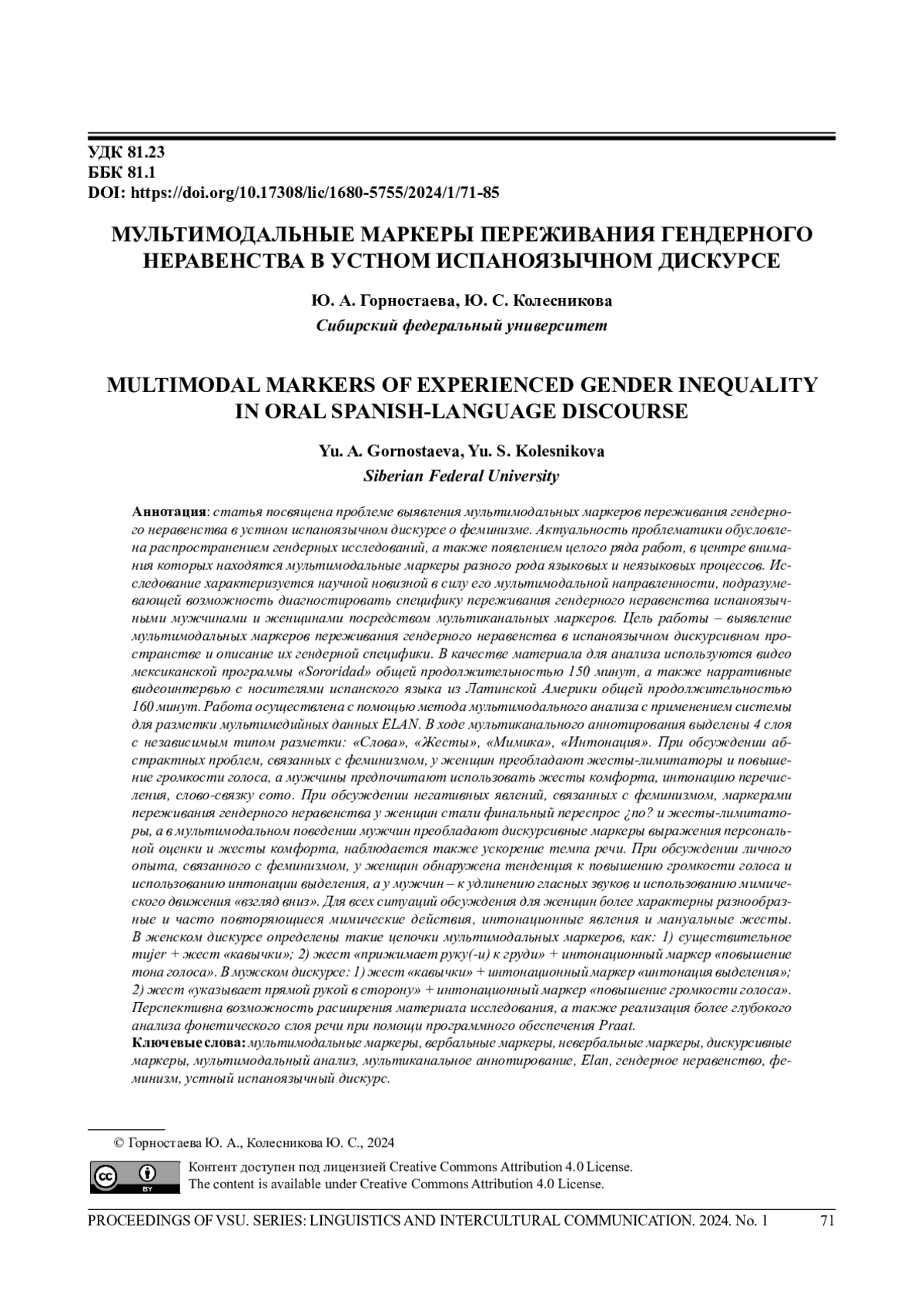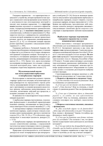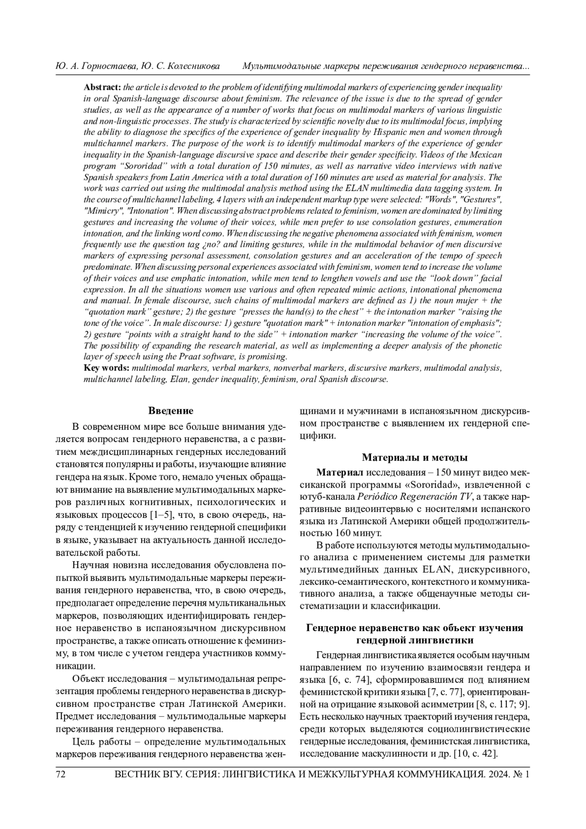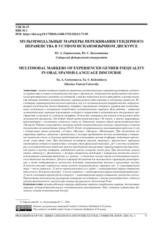 Статья посвящена проблеме выявления мультимодальных маркеров переживания гендерного неравенства в устном испаноязычном дискурсе о феминизме. Актуальность проблематики обусловлена распространением гендерных исследований, а также появлением целого ряда работ, в центре внимания которых находятся мультимодальные маркеры разного рода языковых и неязыковых процессов. Исследование характеризуется научной новизной в силу его мультимодальной направленности, подразумевающей возможность диагностировать специфику переживания гендерного неравенства испаноязычными мужчинами и женщинами посредством мультиканальных маркеров. Цель работы - выявление мультимодальных маркеров переживания гендерного неравенства в испаноязычном дискурсивном пространстве и описание их гендерной специфики. В качестве материала для анализа используются видео мексиканской программы «Sororidad» общей продолжительностью 150 минут, а также нарративные видеоинтервью с носителями испанского языка из Латинской Америки общей продолжительностью 160 минут. Работа осуществлена с помощью метода мультимодального анализа с применением системы для разметки мультимедийных данных ELAN. В ходе мультиканального аннотирования выделены 4 слоя с независимым типом разметки: «Слова», «Жесты», «Мимика», «Интонация». При обсуждении абстрактных проблем, связанных с феминизмом, у женщин преобладают жесты-лимитаторы и повышение громкости голоса, а мужчины предпочитают использовать жесты комфорта, интонацию перечисления, слово-связку como. При обсуждении негативных явлений, связанных с феминизмом, маркерами переживания гендерного неравенства у женщин стали финальный переспрос ino? и жесты-лимитаторы, а в мультимодальном поведении мужчин преобладают дискурсивные маркеры выражения персональной оценки и жесты комфорта, наблюдается также ускорение темпа речи. При обсуждении личного опыта, связанного с феминизмом, у женщин обнаружена тенденция к повышению громкости голоса и использованию интонации выделения, а у мужчин - к удлинению гласных звуков и использованию мимического движения «взгляд вниз». Для всех ситуаций обсуждения для женщин более характерны разнообразные и часто повторяющиеся мимические действия, интонационные явления и мануальные жесты. В женском дискурсе определены такие цепочки мультимодальных маркеров, как: 1) существительное mujer + жест «кавычки»; 2) жест «прижимает руку(-и) к груди» + интонационный маркер «повышение тона голоса». В мужском дискурсе: 1) жест «кавычки» + интонационный маркер «интонация выделения»; 2) жест «указывает прямой рукой в сторону» + интонационный маркер «повышение громкости голоса». Перспективна возможность расширения материала исследования, а также реализация более глубокого анализа фонетического слоя речи при помощи программного обеспечения Praat.