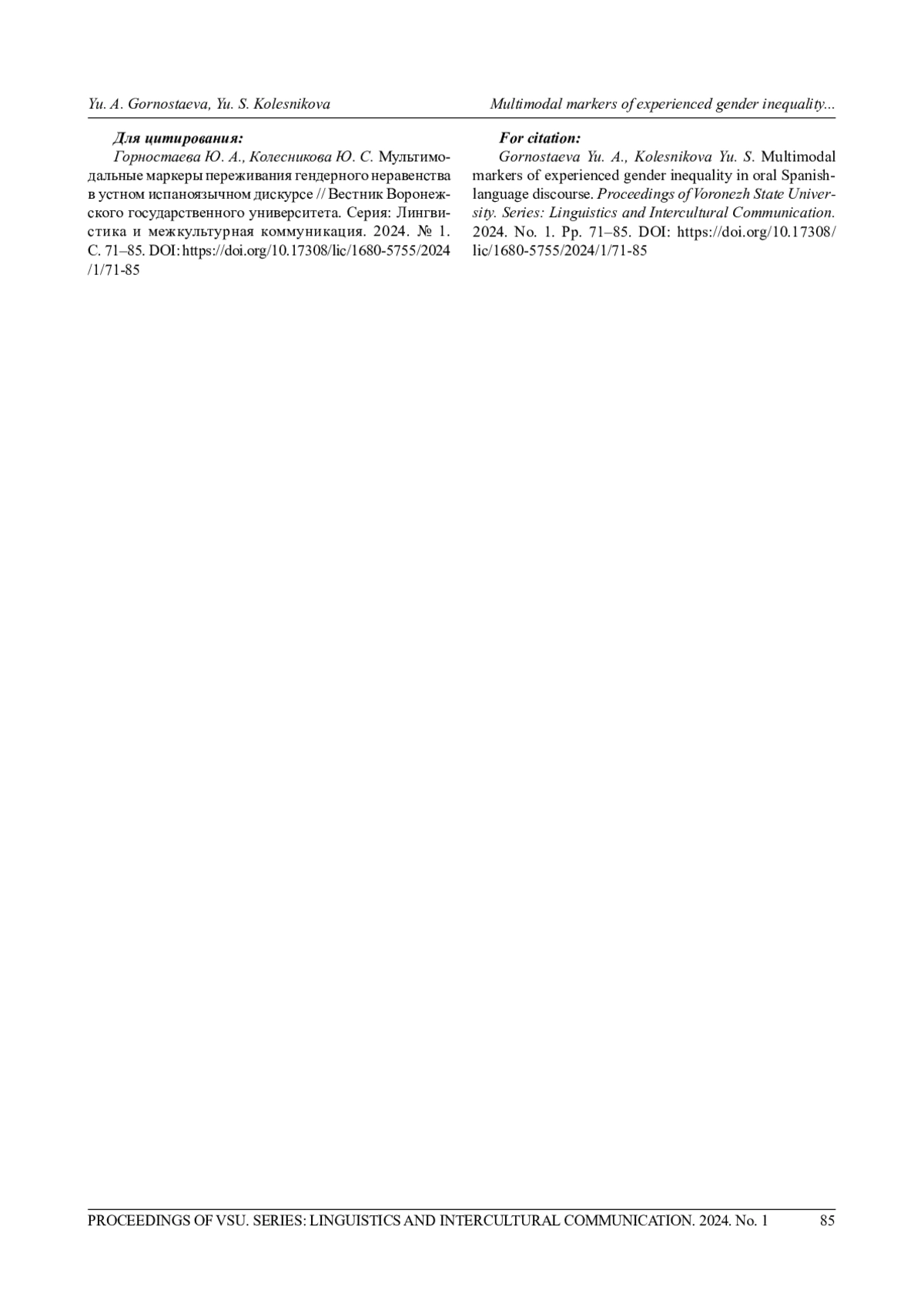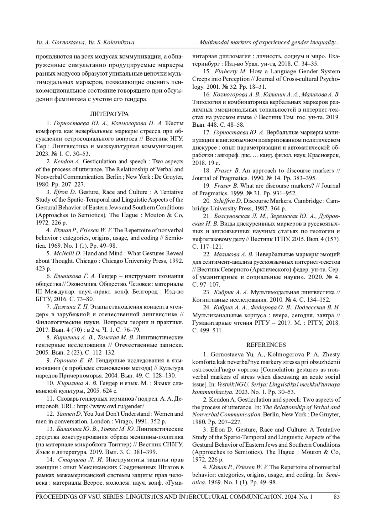 1. Горностаева Ю. А., Колмогорова П. А. Жесты комфорта как невербальные маркеры стресса при обсуждении остросоциального вопроса // Вестник НГУ Сер.: Лингвистика и межкультурная коммуникация. 2023. № 1. С. 30-53. EDN: XZFEQW