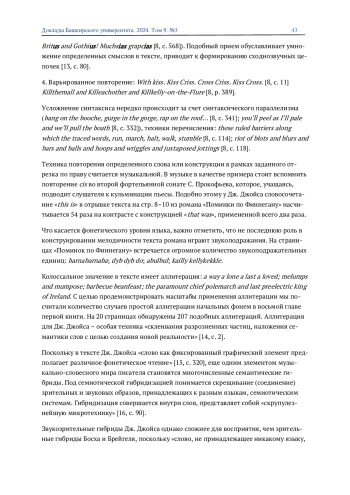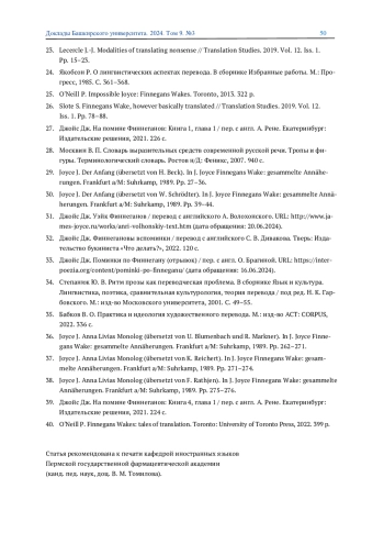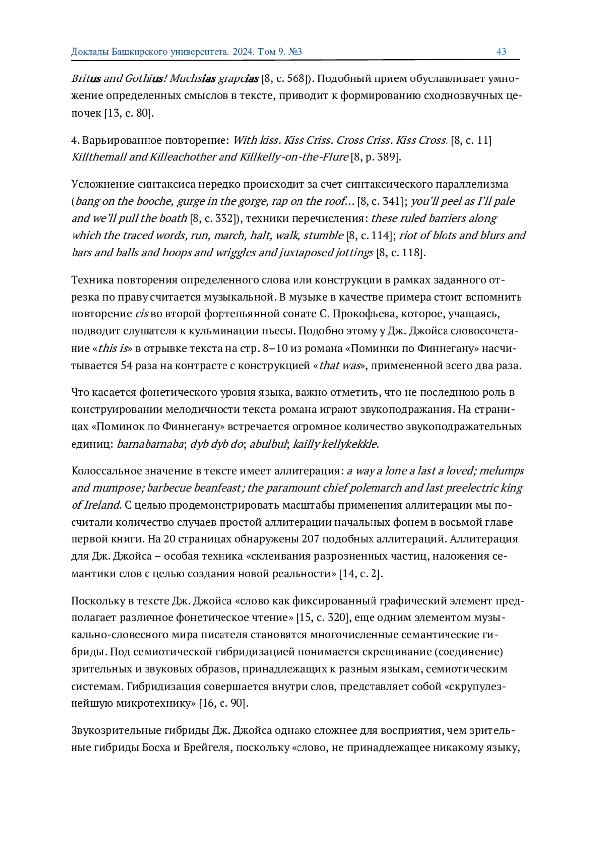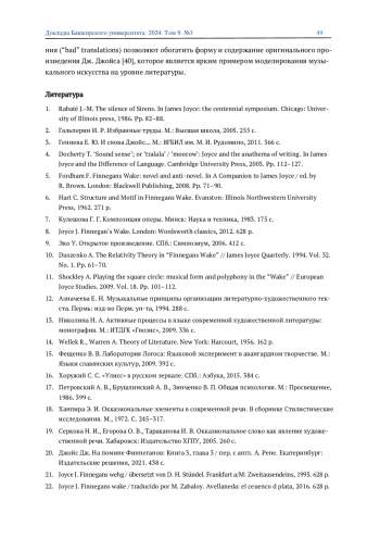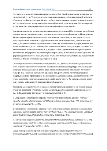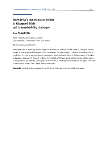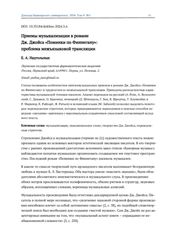 НАУГОЛЬНЫХ Е. А. ПРИЕМЫ МУЗЫКАЛИЗАЦИИ В РОМАНЕ ДЖ. ДЖОЙСА "ПОМИНКИ ПО ФИННЕГАНУ": ПРОБЛЕМА МЕЖЪЯЗЫКОВОЙ ТРАНСЛЯЦИИ // ДОКЛАДЫ БАШКИРСКОГО УНИВЕРСИТЕТА. 2024. Т. 9 № 3