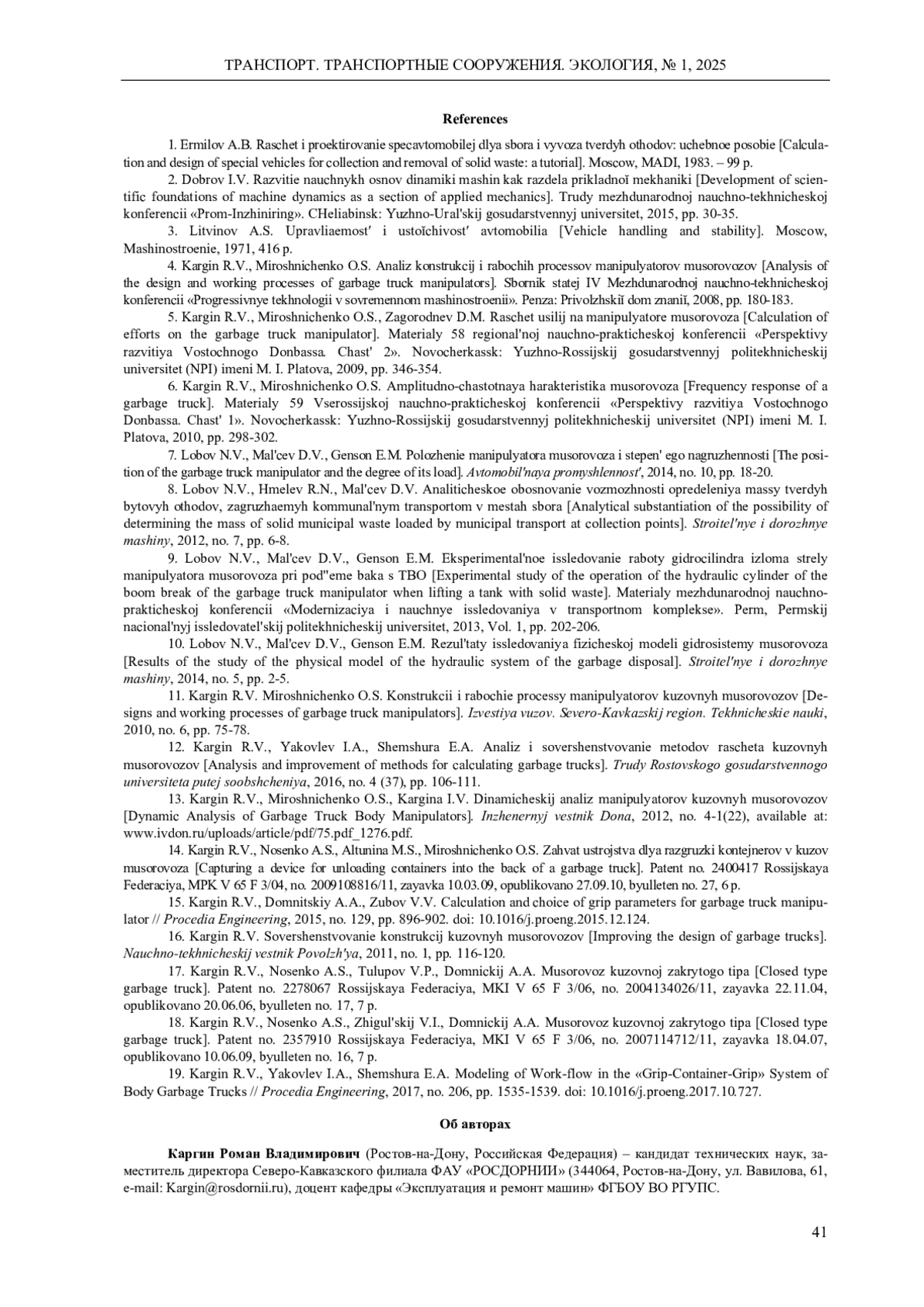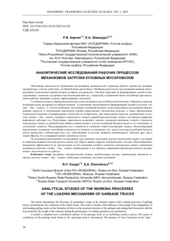 Обоснована актуальность проведения исследования динамического характера рабочих процессов кузовных мусоровозов с учетом свободных колебаний рамы автомобиля. Обобщены результаты исследований влияния конструктивного исполнения манипуляторов кузовных мусоровозов с боковой загрузкой на формирование усилий в конструктивных элементах мусоровоза при взаимодействии их с нагрузкой, создаваемой весом контейнера при выполнении рабочих операций: подъем, опрокидывание, опускание. Составлена модель и приведена расчетная схема мусоровоза как колебательной системы. Определен характер колебаний рамы мусоровоза в рабочем режиме. Установлены закономерности формирования усилий в системе «захват - бак - захват». С учетом свободных затухающих колебаний базового шасси выполнены исследования формирования нагрузок и оптимизация параметров серийно выпускаемых механизмов загрузки, а также оригинальных технических решений, подтвержденных патентами на изобретения. Для определения нагрузок, возникающих в системе «захват - бак - захват» серийного «вилочного» захвата, разработаны расчетные схемы и составлены уравнения равновесия действия сил. Полученные зависимости позволяют оценить изменение величины усилий в элементах конструкции захвата за рабочий цикл работы манипулятора с учетом колебаний базового шасси и их отклонение от статических нагрузок. Моделированием сил и моментов в элементах новой конструкции захвата, обеспечивающей вертикальное положение контейнера в процессе его подъема, установлено, что после затухания колебаний базового шасси происходит стабилизация всех сил, действующих в системе, моменты компенсируют действие друг друга таким образом, что суммарный момент стремится к нулю. На основании выполненных исследований дано решение актуальной научно-технической задачи, состоящей в совершенствовании методов расчета машин для сбора и вывоза твердых коммунальных отходов, обеспечивающих повышение эффективности их эксплуатации за счет снижения усилий в элементах конструкции захвата, повышения надежности системы «захват - бак - захват» манипулятора и его привода, повышения производительности мусоровозов и экологичности их работы.