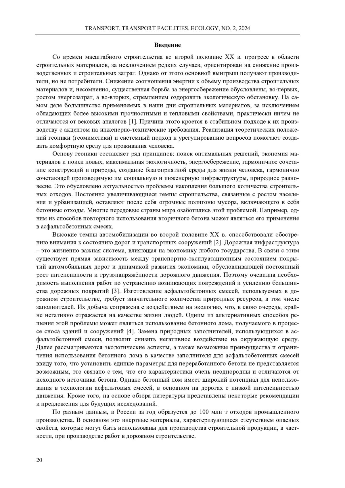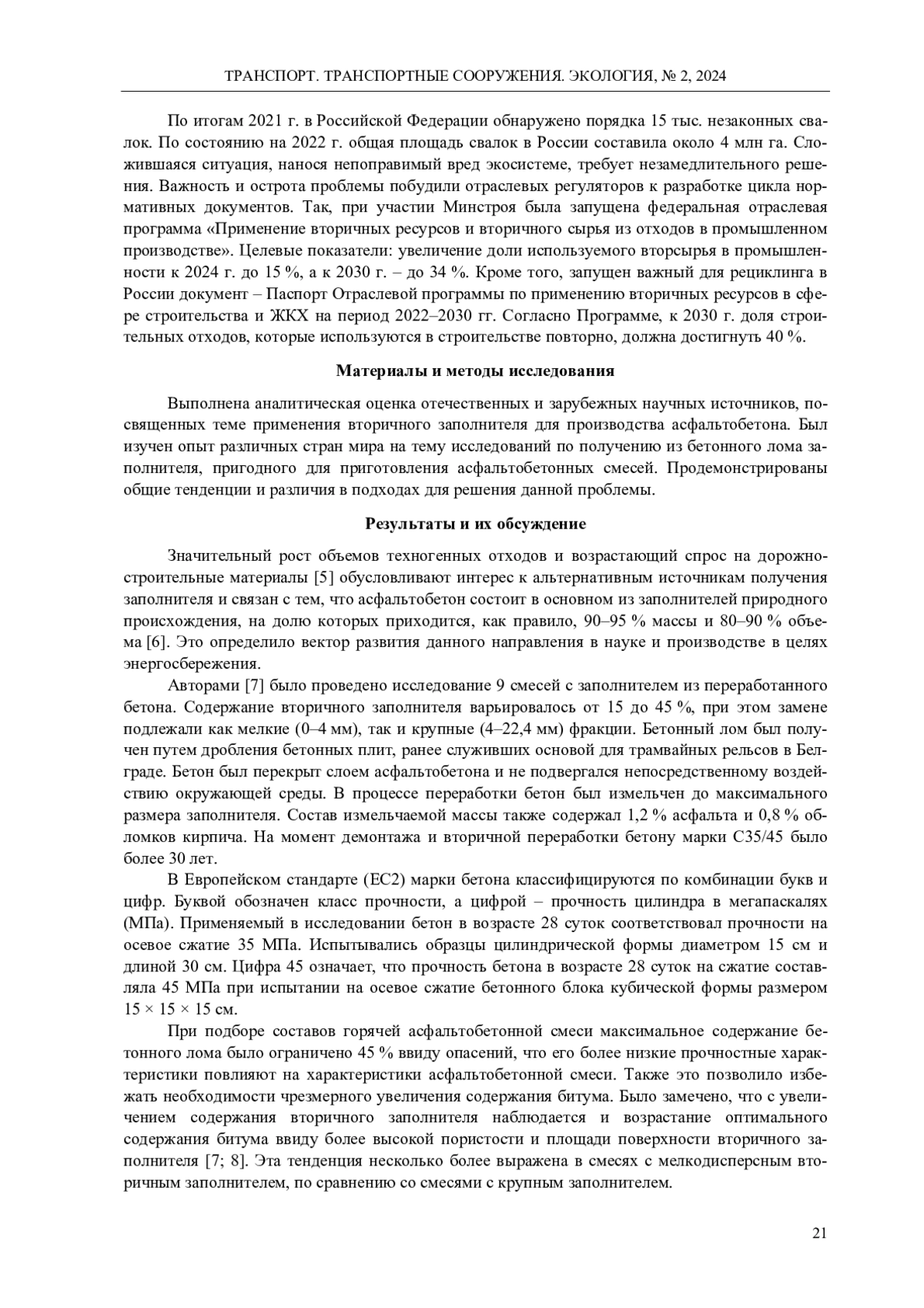 Приведен обзор исследований о возможности и перспективе применения переработанного бетона в качестве заполнителя для асфальтобетонной смеси. Рассматривается вопрос эффективности и экологической целесообразности включения переработанного бетона в технологию производства асфальтобетонных смесей. Обсуждается необходимость поиска устойчивых и экономически выгодных решений в дорожном строительстве и текущем содержании автомобильных дорог с использованием переработанного бетона. В качестве методов исследования используются: патентный поиск, систематизация, описание и анализ. Аналитический обзор информации выполняется по результатам отечественных и зарубежных статей, связанных с темой вторичных заполнителей и практического опыта их использования. Подробно описываются различные методы получения бетонного лома и представлены результаты испытаний образов асфальтобетонной смеси с добавлением заполнителей, содержащих вторичный заполнитель. Полученные результаты демонстрируют, что использование переработанного бетонного лома в качестве заполнителя горячей асфальтобетонной смеси является целесообразной и эффективной технологической операцией. Свойства полученного материала соответствуют действующим нормативным документам стран, проводящих исследование. В процессе выполнения исследования, а также анализа полученных результатов были рассмотрены различные иностранные работы по приготовлению горячего асфальтобетона. Установлено, что асфальтобетон, приготовленный на основе вторичного заполнителя, соответствуют предъявляемым стандартам качества. Подчеркивается потенциал переработанного бетона в качестве экологически чистого и экономически выгодного компонента для производства асфальтобетонных смесей. Таким образом, используя полученные знания, можно заключить, что исследование применения переработанного бетонного лома в качестве заполнителя для горячей асфальтобетонной смеси с точки зрения геоники является актуальным на сегодняшний день.
