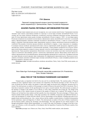 Транспорт играет важную роль как для государства, так и для отдельно взятой семьи. Санкционная политика западных стран оказала существенное влияние на структуру и состав парка легковых автомобилей России. За последние два года страну покинули 46 брендов, усложнилась логистика снабжения запасными частями, увеличились цены. В статье представлен анализ рынка легковых автомобилей в России в период с 2022 г. по настоящее время. В качестве материалов исследования использовались официальные данные автомобильной статистики за указанный период. Проанализирована динамика изменения численности автомобилей в России, а также их состав и средний возраст, изменение структуры продаж новых транспортных средств в сторону увеличения количества китайских автомобилей. Исследована статистика продаж китайских автомобилей по маркам, а также определена их специфика. К основным плюсам китайских производителей можно отнести современный дизайн продукции, широкий ассортиментный ряд, наличие электроники и дополнительных функций, а также развитие дилерской сети в России. Ключевыми недостатками являются сложность поиска запасных частей на непопулярные марки и на автомобили снятые с производства. Также различное программное обеспечение и полное или частичное отсутствие технической документации на техническое обслуживание, ремонт и диагностику транспортных средств. Представлен анализ выхода китайских производителей на российский рынок, проанализированы преимущества и недостатки. Основным подходом для новых брендов остаются продажи через посредников, без официального представительства. В результате исследования установлена динамика изменения парка легковых автомобилей в России, а также специфика развития после введения санкций от западных стран.