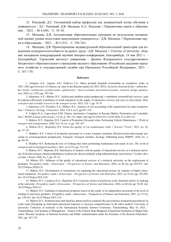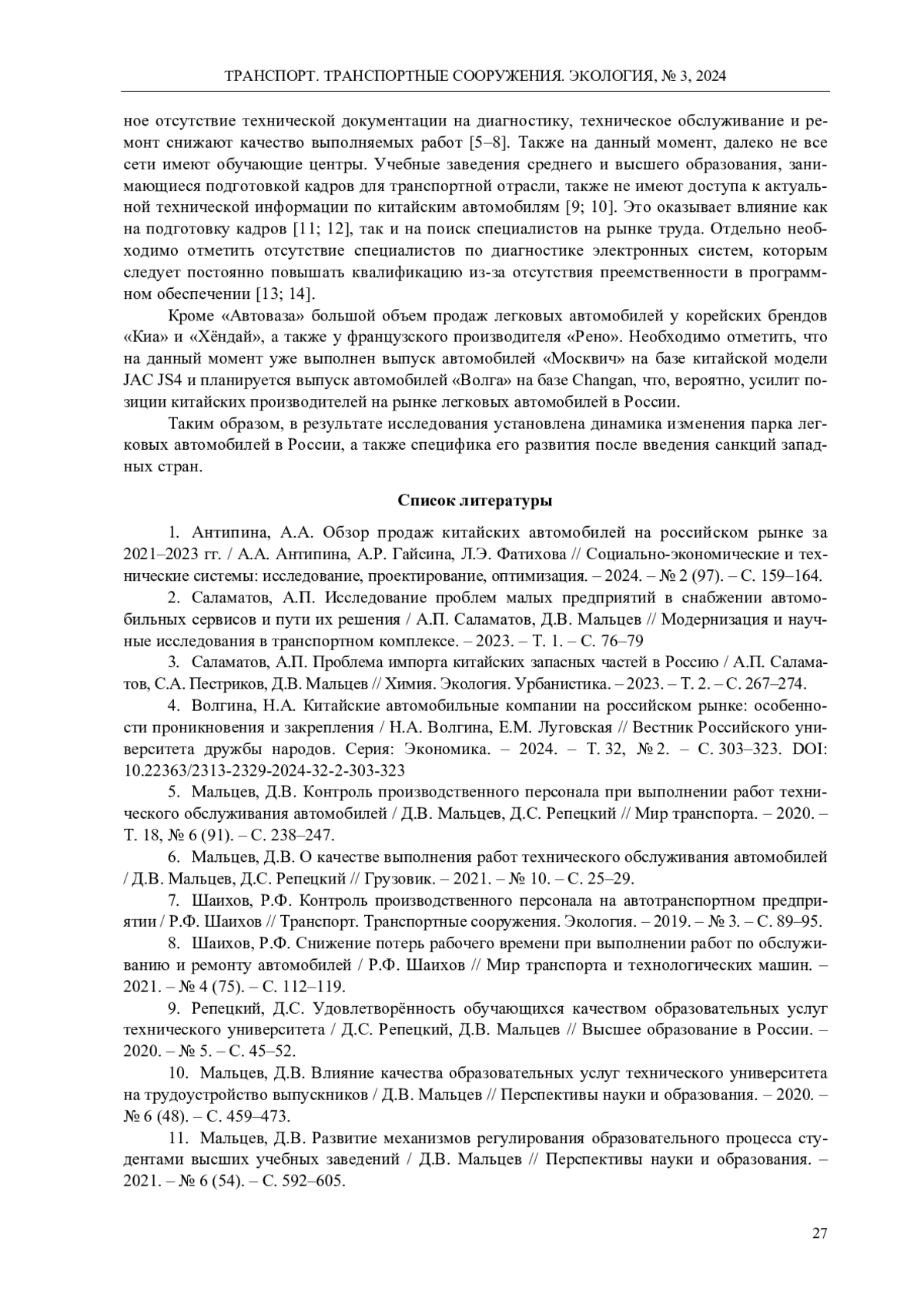 2. Саламатов, А.П. Исследование проблем малых предприятий в снабжении автомобильных сервисов и пути их решения / А.П. Саламатов, Д.В. Мальцев // Модернизация и научные исследования в транспортном комплексе. - 2023. - Т. 1. - С. 76-79. EDN: DFKWUB