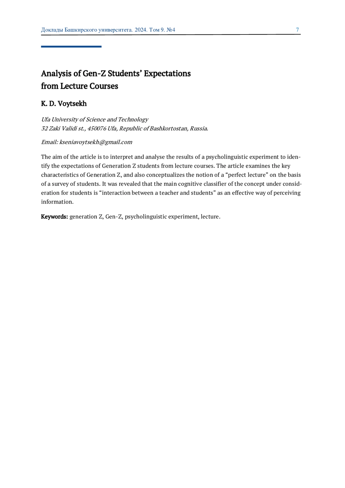Статья посвящена интерпретации и анализу результатов психолингвистического эксперимента по выявлению ожиданий студентов поколения Z от лекционных курсов. В статье рассматриваются ключевые характеристики поколения Z, а также происходит концептуализация понятия «идеальная лекция» на основе анкетирования студентов. Выявлено, что основным когнитивным классификатором рассматриваемого понятия для студентов является «взаимодействие преподавателя со студентами» как эффективный способ восприятия информации.
