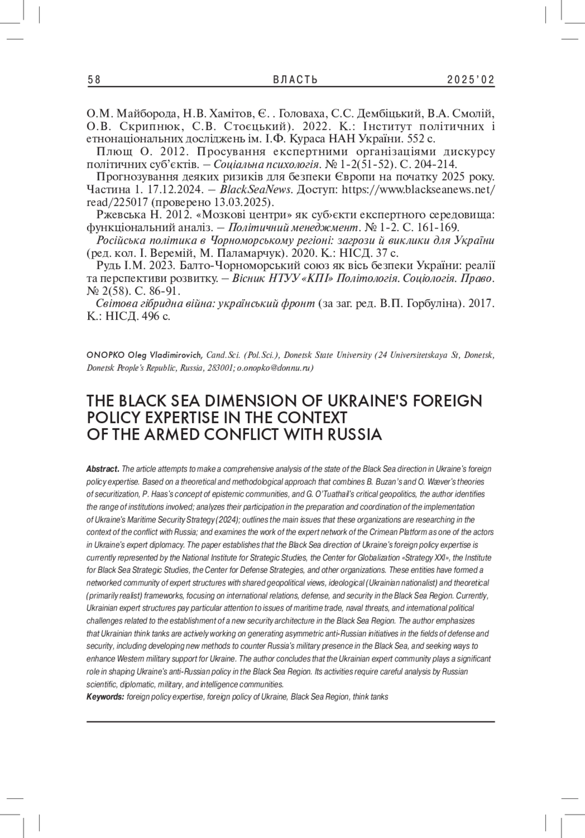 19. Vorotnyuk M. 2024. Black Sea as a Battlefield: Ukraine’s Perspectives and Strategies in the Region. - Security Dynamics in the Black Sea Region: Geopolitical Shifts and Regional Orders. Cham: Springer Nature Switzerland. P. 111-128.