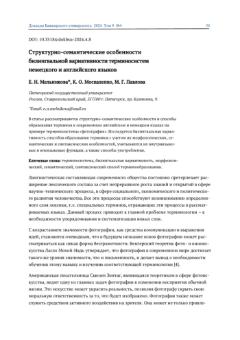 В статье рассматриваются структурно-семантические особенности и способы образования терминов в современном английском и немецком языках на примере терминосистемы «фотография». Исследуется билингвальная вариативность способов образования терминов с учетом их морфологических, семантических и синтаксических особенностей, учитываются их внутриязыковые и внеязыковые функции, а также способы употребления.