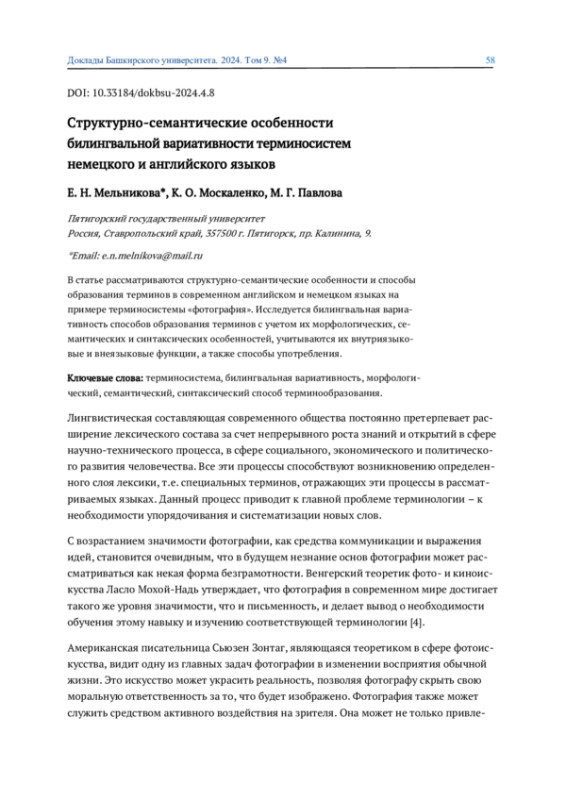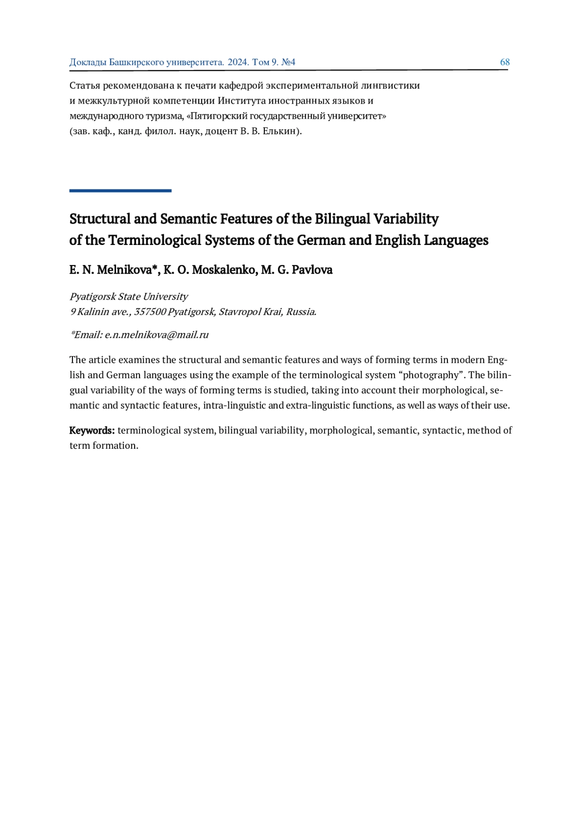 МЕЛЬНИКОВА Е. Н., МОСКАЛЕНКО К. О., ПАВЛОВА М. Г. СТРУКТУРНО-СЕМАНТИЧЕСКИЕ ОСОБЕННОСТИ БИЛИНГВАЛЬНОЙ ВАРИАТИВНОСТИ ТЕРМИНОСИСТЕМ НЕМЕЦКОГО И АНГЛИЙСКОГО ЯЗЫКОВ // ДОКЛАДЫ БАШКИРСКОГО УНИВЕРСИТЕТА. 2024. Т. 9 № 4