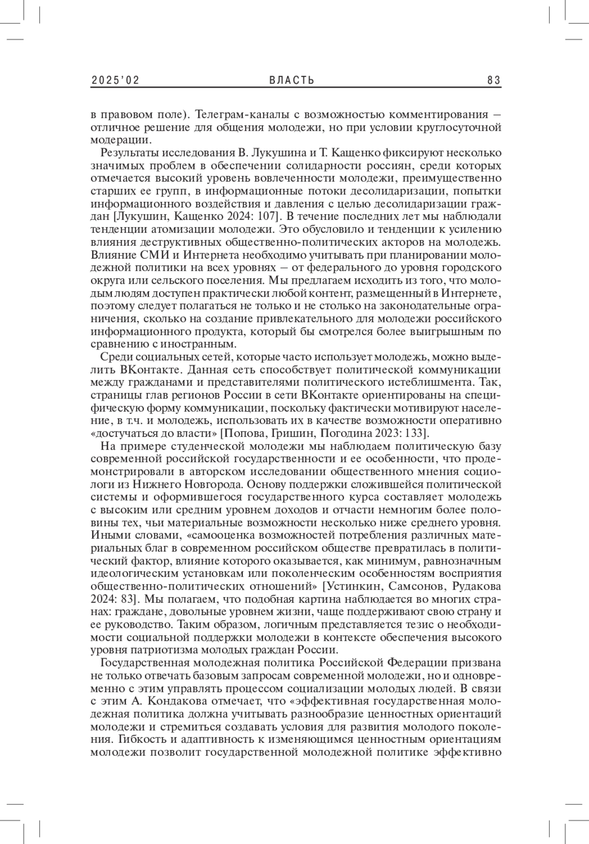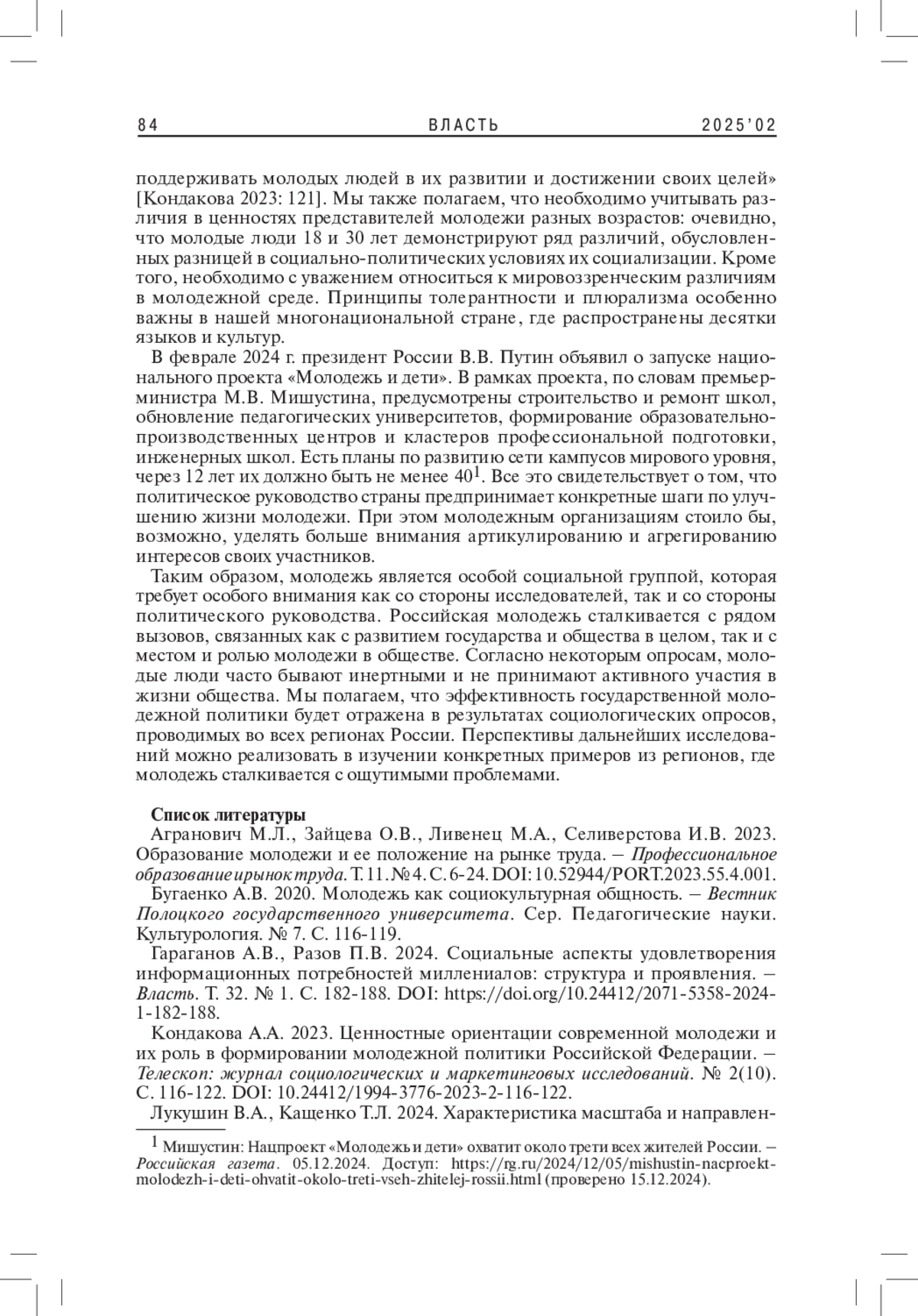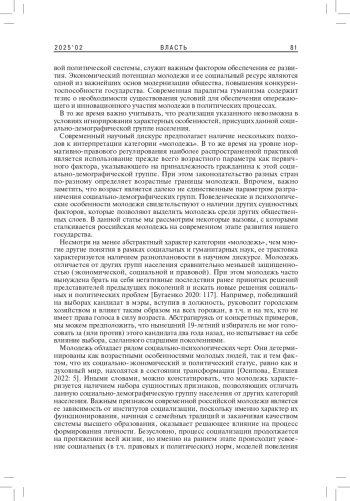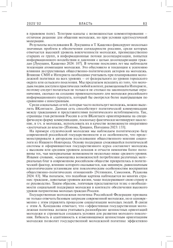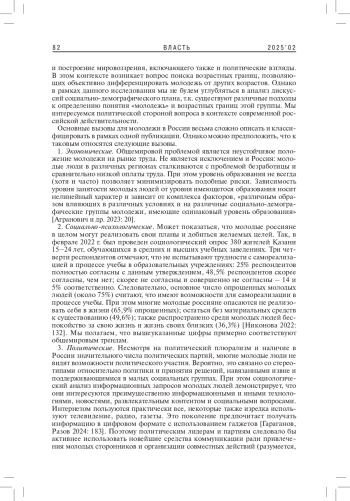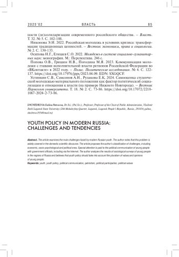 ЩЕДРОВА Г. П. МОЛОДЕЖНАЯ ПОЛИТИКА В СОВРЕМЕННОЙ РОССИИ: ВЫЗОВЫ И ТЕНДЕНЦИИ // ВЛАСТЬ. 2025. ТОМ 33 № 2