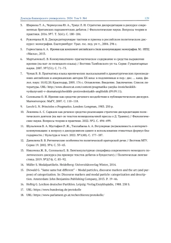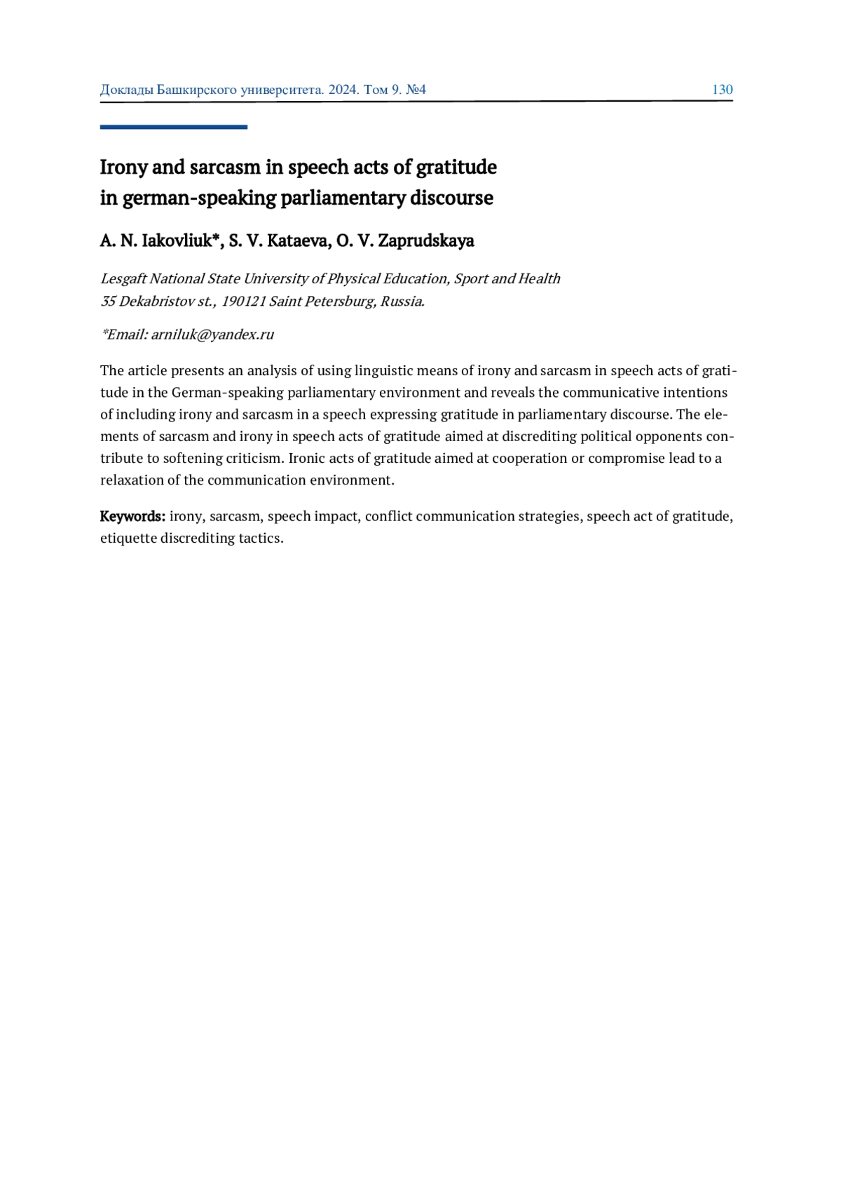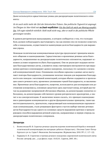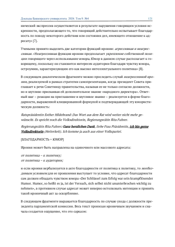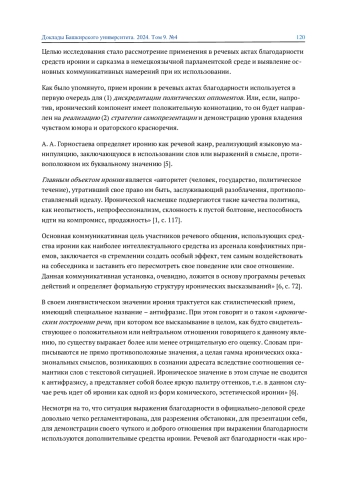 ЯКОВЛЮК А. Н., КАТАЕВА С. В., ЗАПРУДСКАЯ О. В. ИРОНИЯ И САРКАЗМ В РЕЧЕВЫХ АКТАХ БЛАГОДАРНОСТИ В НЕМЕЦКОЯЗЫЧНОМ ПАРЛАМЕНТСКОМ ДИСКУРСЕ // ДОКЛАДЫ БАШКИРСКОГО УНИВЕРСИТЕТА. 2024. Т. 9 № 4
