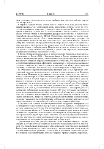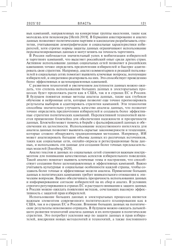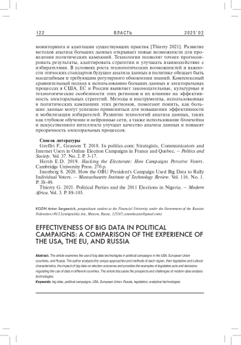КОЗИН А. С. ЭФФЕКТИВНОСТЬ ИСПОЛЬЗОВАНИЯ БОЛЬШИХ ДАННЫХ В ПОЛИТИЧЕСКИХ КАМПАНИЯХ: СРАВНЕНИЕ ОПЫТА США, ЕС И РОССИИ // ВЛАСТЬ. 2025. ТОМ 33 № 2