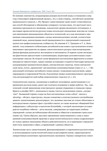 6. Хрущева О. А. Синкретизм значения заимствованного слова // Когнитивные исследования языка. 2024. Вып. 5(61): Когнитивные описания языка: концепции, методы, процедуры: мат-лы круглого стола, Москва, 31 окт. - 1 нояб. 2024 г. / гл. ред. вып. О. К. Ирисханова. Тамбов: изд. дом “Державинский”. С. 211-215. EDN: ZIDWLN