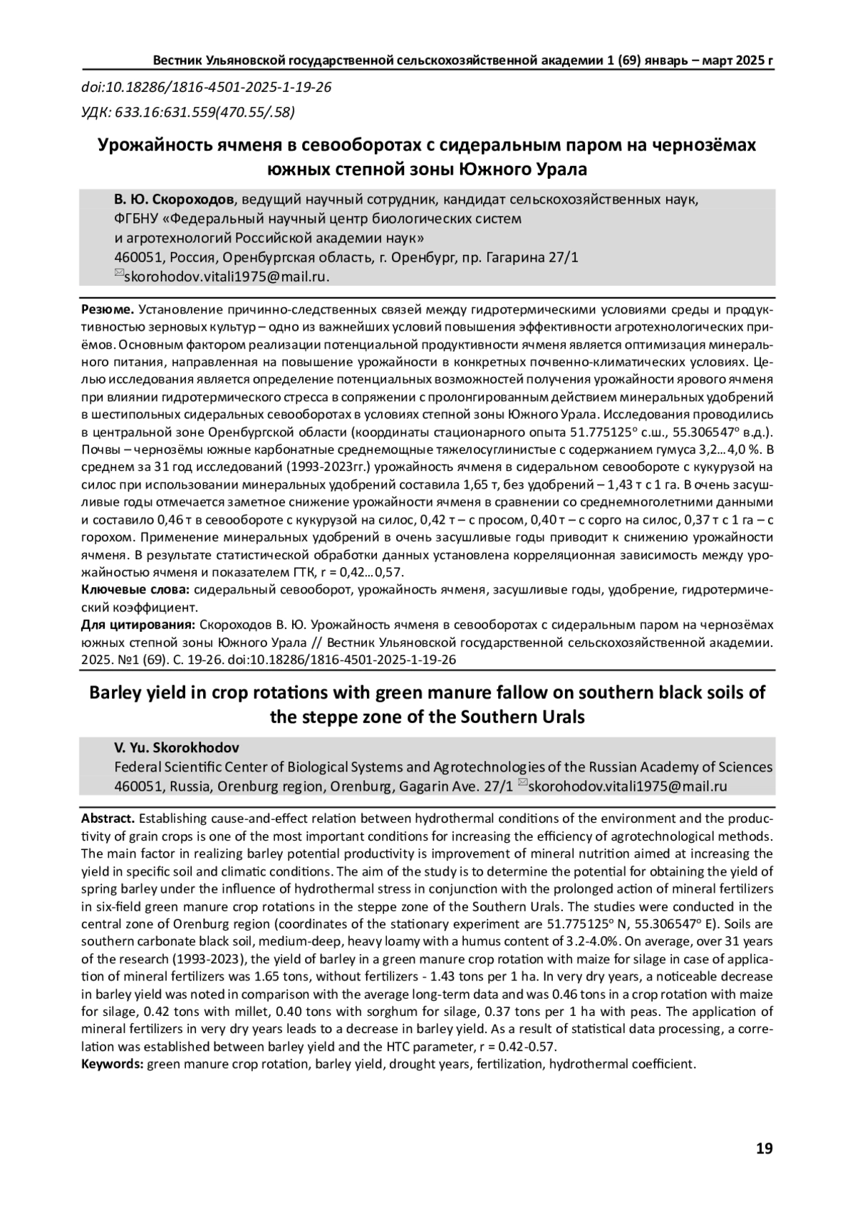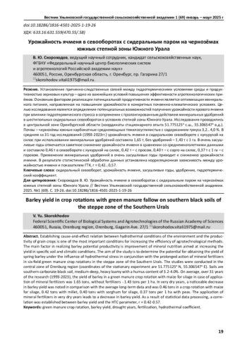 СКОРОХОДОВ В. Ю. УРОЖАЙНОСТЬ ЯЧМЕНЯ В СЕВООБОРОТАХ С СИДЕРАЛЬНЫМ ПАРОМ НА ЧЕРНОЗЁМАХ ЮЖНЫХ СТЕПНОЙ ЗОНЫ ЮЖНОГО УРАЛА // ВЕСТНИК УЛЬЯНОВСКОЙ ГОСУДАРСТВЕННОЙ СЕЛЬСКОХОЗЯЙСТВЕННОЙ АКАДЕМИИ. 2025. № 1 (69)