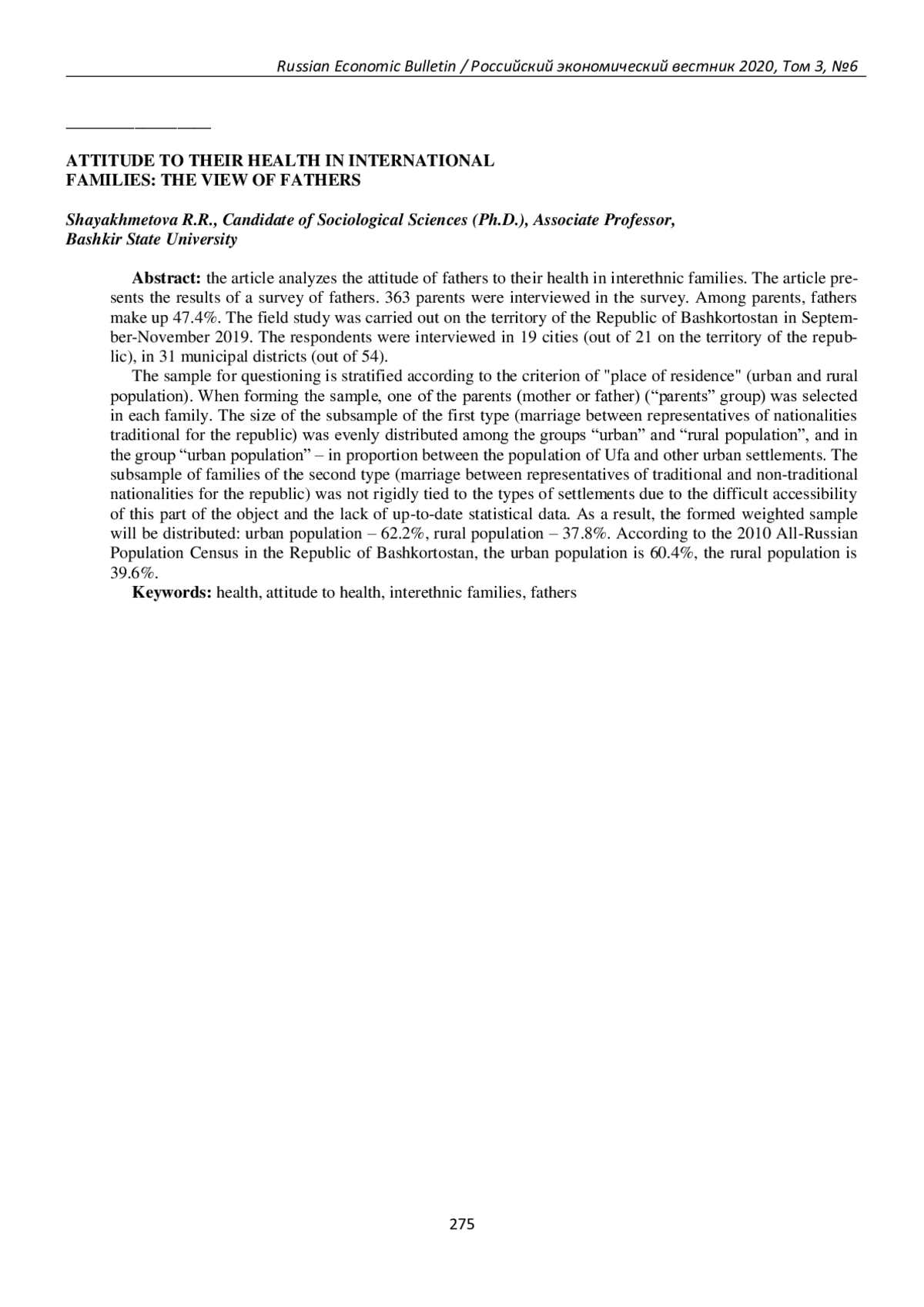 В статье анализируется отношение отцов к своему здоровью в межэтнических семьях. В статье приводятся результаты опроса отцов. В анкетировании опрошено 363 родителя. Среди родителей отцы составляют 47,4%. Полевое исследование проводилось на территории Республики Башкортостан в сентябре-ноябре 2019 года. Респонденты опрошены в 19 городах (из 21 на территории республики), в 31 муниципальном районе (из 54).