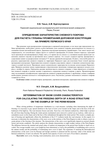 При решении задач распределения температуры в дорожной конструкции, в том числе при определении глубины промерзания, необходимо уделить особое внимание слою снежного покрова, расположенного на откосах и у основания насыпи автомобильной дороги. Дорожная конструкция промерзает неравномерно. Снег имеет малую теплопроводность, что способствует защите грунта от глубокого промерзания. В течение зимнего периода с проезжей части производят механизированную уборку снега, в то время как на откосах и у основания насыпи происходит накопление снежного массива на протяжении всего зимнего периода. Это создает сложную картину промерзания и существенно влияет на распределение изотермы 0 °C внутри дорожной конструкции. В связи с этим необходимо определить характеристики снежного покрова на территории Пермского края для получения более точной картины промерзания конструкции. Характеристики снежного покрова существенно зависят от внешних климатических факторов и условий местности. Произведен анализ климатических характеристик на восьми метеостанциях Пермского края. Выявлено различие между нормативными и фактическими значениями температуры наружного воздуха в период с октября по апрель. Определена средняя месячная высота снежного покрова, а также вероятность установления снежного покрова в осенние месяцы и вероятность сохранения снежного покрова в апреле. Проанализирован опыт исследования теплофизических характеристик снежного покрова российских и зарубежных ученых и выбраны необходимые значения плотности и теплопроводности снега. Рассчитана удельная теплоемкость снежного покрова толщиной до 30 см.