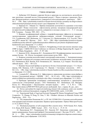 1. Дубинчик О.И. Влияние коррозии бетона и арматуры на долговечность железобетонных пролетных строений мостов [Электронный ресурс] // Наука и прогресс транспорта. Вестник Днепропетровского национального университета железнодорожного транспорта. - 2005. - № 6. - URL: https://cyberleninka.ru/article/n/vliyanie-korrozii-betona-i-armatury-na-dolgovechnost-zhelezobetonnyh-proletnyh-stroeniy-mostov (дата обращения: 20.11.2022). EDN: VWACLD