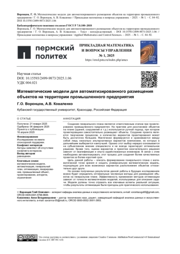 При проектировании генерального плана одними из основных нормативных документов являются [1–3]. На основе нормативных требований разрабатывается проектная и рабочая документация для строительства будущего завода. Качество планировки предприятия имеет прямое влияние на стоимость его строительства и эксплуатации. Вопрос расположения объектов в производственной системе исследовался в работах [4–8]. На сегодняшний день проблема автоматизированного размещения объектов на территории промышленного предприятия является актуальной